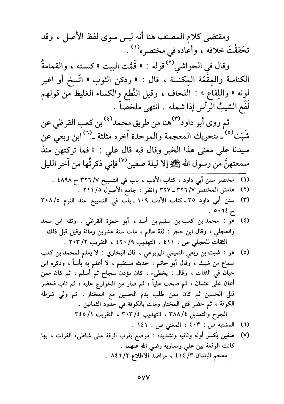 ثم روى أبو داود هنا من طريق محمد بن كعب القرظي عن شَبَث -بتحريك المعجمة والموحدة آخره مثلثة- ابن ربعي عن سيدنا علي معنى هذا الخبر وقال فيه قال علي: "فما تركتهن منذ سمعتهنَّ من رسول الله -صلى الله عليه وسلم- إلا ليلة صفين فإني ذكرتُها من آخر الليل