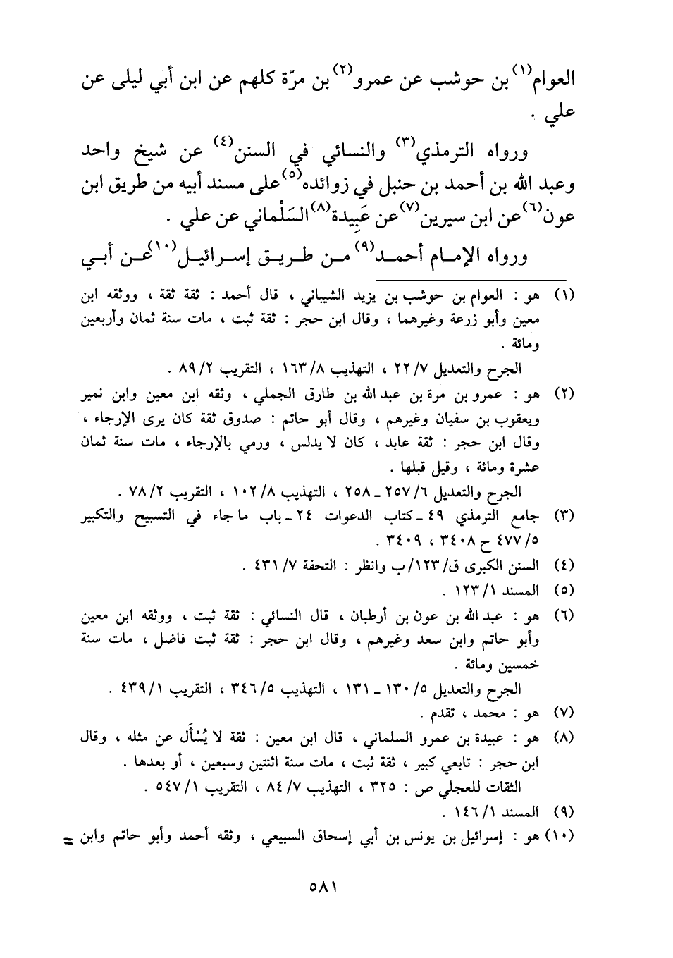 ورواه الترمذي والنسائي في السنن عن شيخ واحد وعبد الله بن أحمد بن حنبل في زوائده على مسند أبيه من طريق ابن عون عن ابن سيرين عن عبيدة السَلماني عن علي.