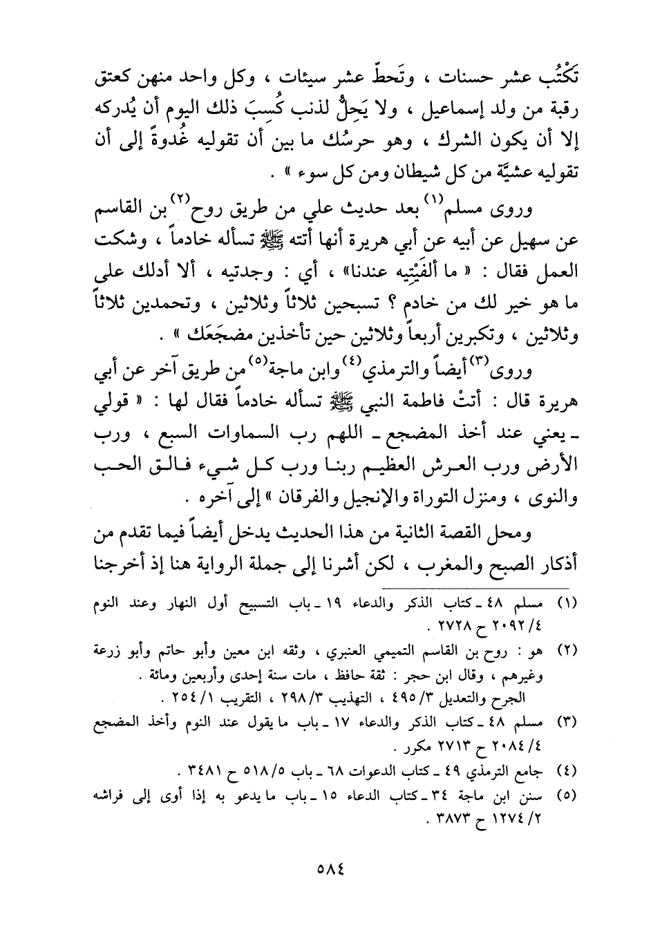 ومحل القصة الثانية من هذا الحديث يدخل أيضاً فيما تقدم من أذكار الصبح والمغرب، لكن أشرنا إلى جملة الرواية هنا إذ أخرجنا