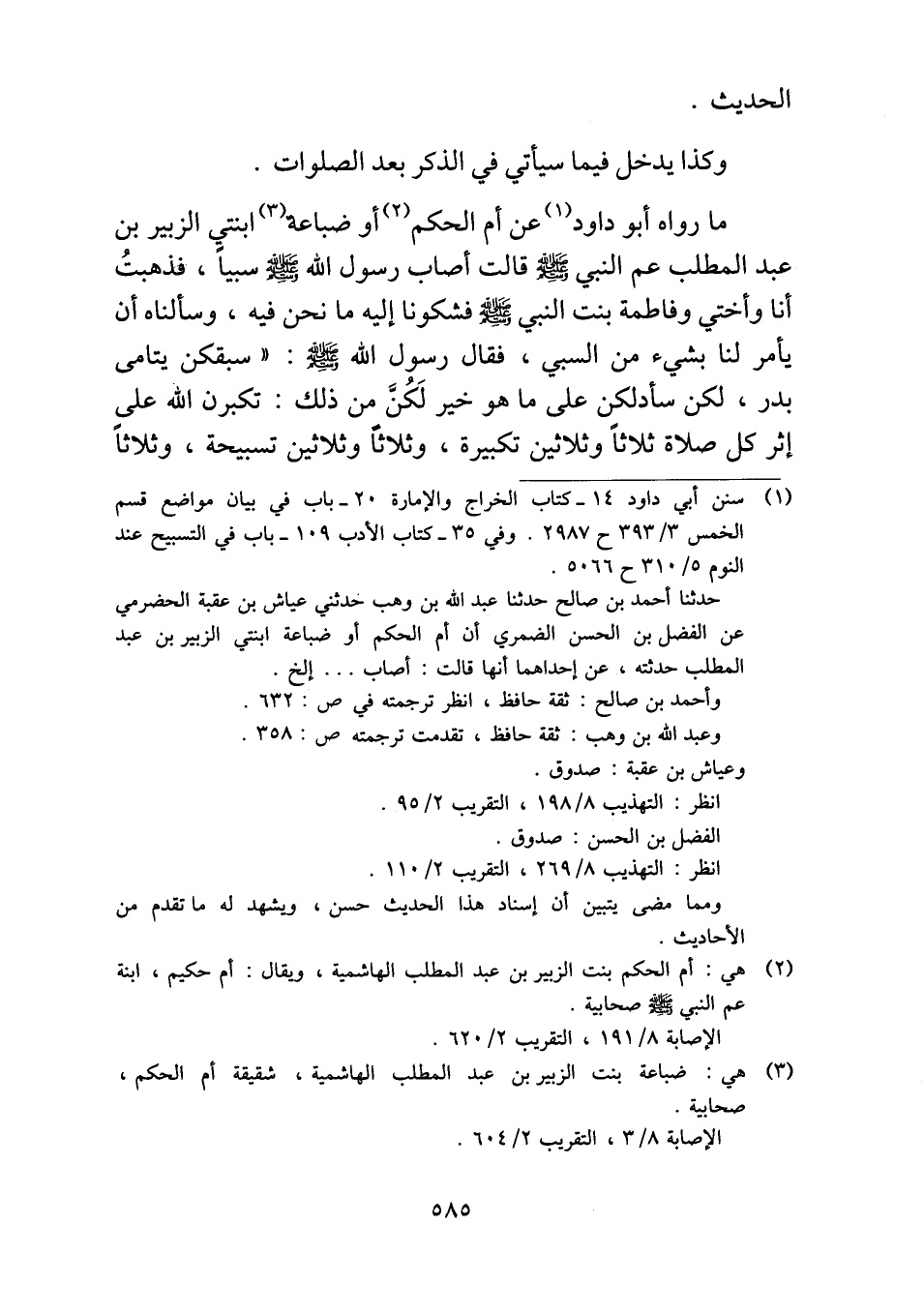 ما رواه أبو داود عن أم الحكم أو ضباعة ابنتي الزبير بن عبد المطلب عم النبي - صلى الله عليه وسلم - قالت أصاب رسول الله- صلى الله عليه وسلم - سبياً، فذهبتُ أنا وأختي وفاطمة بنت النبي -صلى الله عليه وسلم- فشكونا إليه ما نحن فيه، وسألناه أن يأمر لنا بشيء من السبي، فقال رسول الله -صلى الله عليه وسلم-: "سبقكن يتامى بدر، لكن سأدلكن على ما هو خير لَكُنَّ من ذلك: تكبرن الله على إثر كل صلاة ثلاثاً وثلاثين تكبيرة، وثلاثاً وثلاثين تسبيحة، وثلاثاً