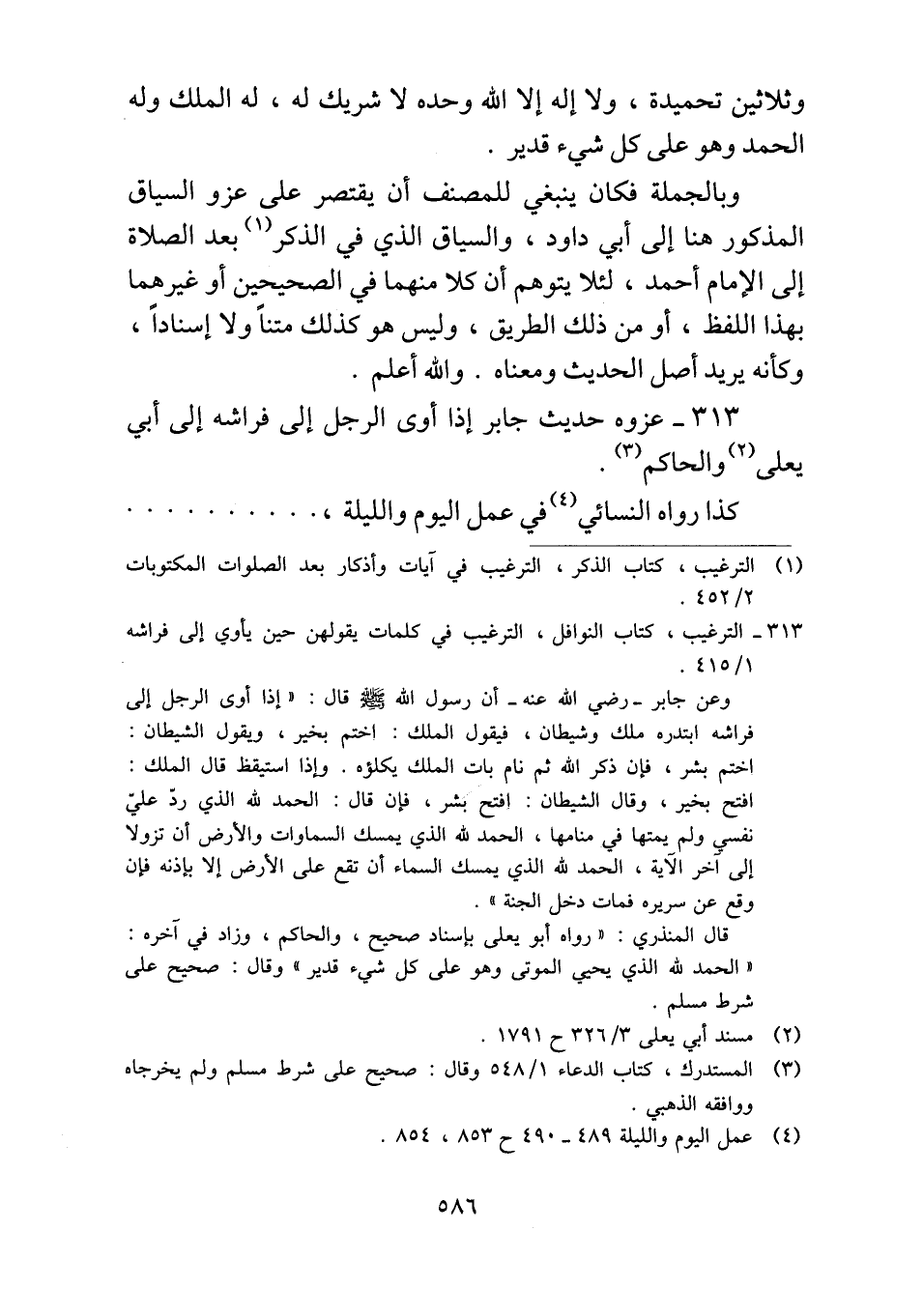 ٣١٣ - عزوه حديث جابر إذا أوى الرجل إلى فراشه إلى أبي يعلى والحاكم.