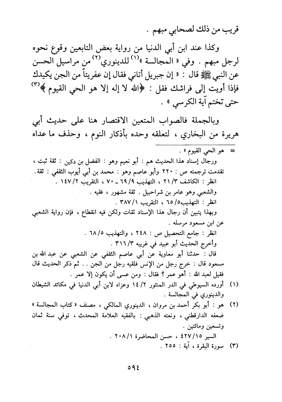 وكذا عند ابن أبي الدنيا من رواية بعض التابعين وقوع نحوه لرجل مبهم. وفي "المجالسة" للدينوري من مراسيل الحسن عن النبي - صلى الله عليه وسلم - قال: "إن جبريل أتاني فقال إن عفريتاً من الجن يكيدك فإذا أويت إلى فراشك فقل: {اللَّهُ لَا إِلَهَ إِلَّا هُوَ الْحَيُّ الْقَيُّومُ} حتى تختم آية الكرسي".