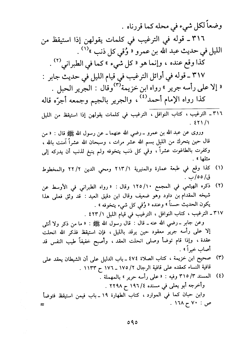 ٣١٧ - قوله في أوائل الترغيب في قيام الليل في حديث جابر: "إلا على رأسه جرير" رواه ابن خزيمة وقال: الجرير الحبل.
