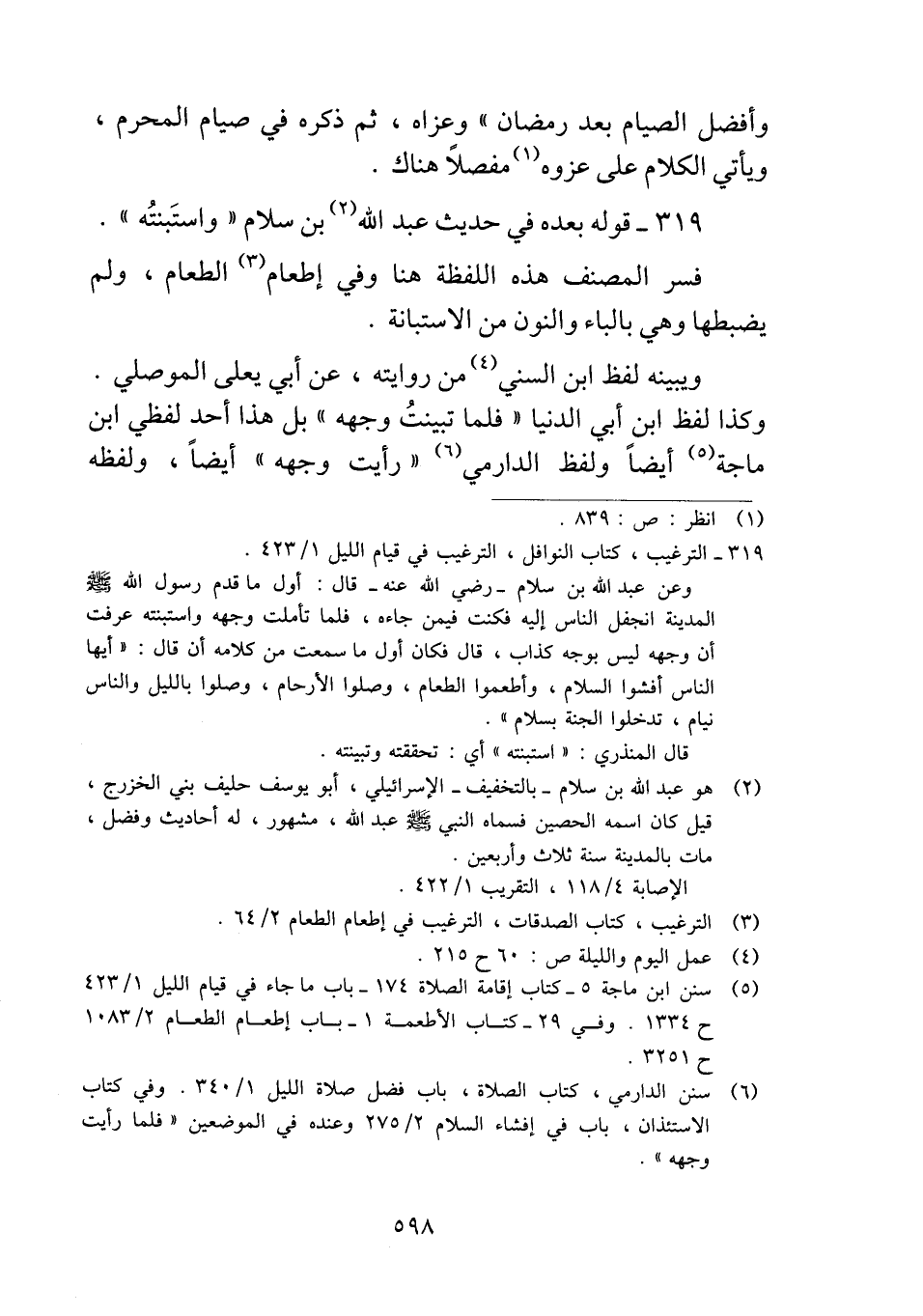 ٣١٩ - قوله بعده في حديث عبد الله بن سلام "واستَبنتُه".