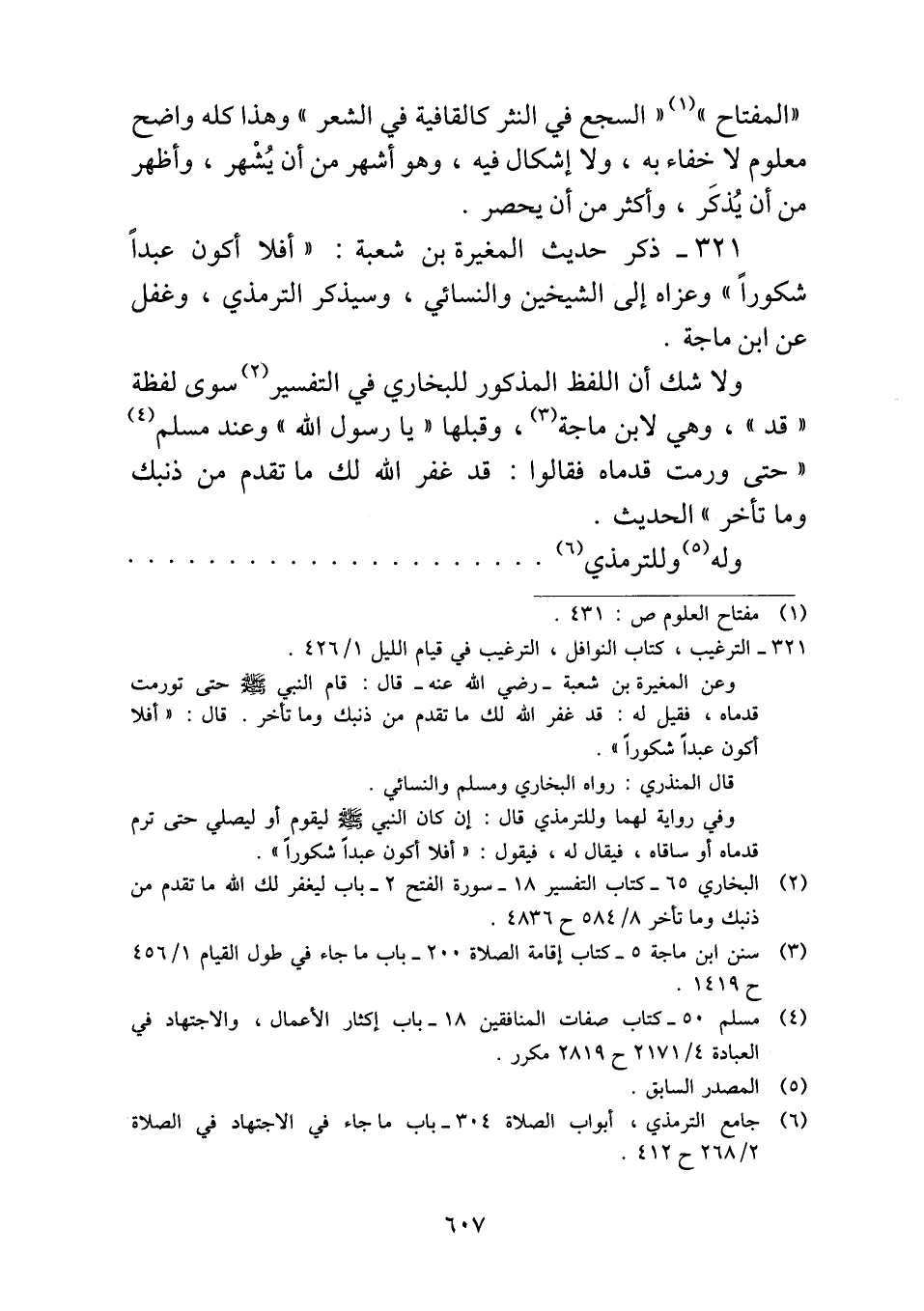 ٣٢١ - ذكر حديث المغيرة بن شعبة: "أفلا أكون عبداً شكوراً" وعزاه إلى الشيخين والنسائي، وسيذكر الترمذي، وغفل عن ابن ماجة.