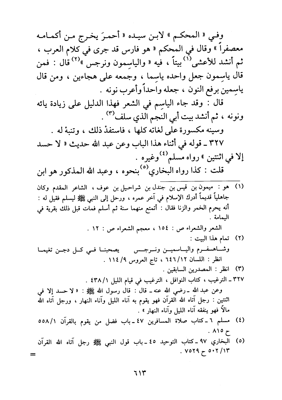 ٣٢٧ - قوله في أثناء هذا الباب وعن عبد الله حديث "لا حسد إلا في اثنتين" رواه مسلم وغيره.