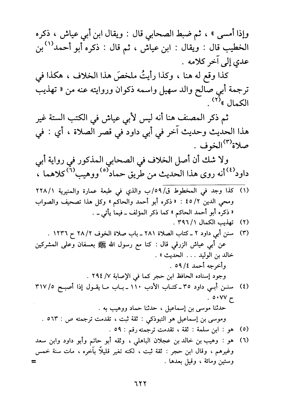ثم ذكر المصنف هنا أنه ليس لأبي عياش في الكتب الستة غير هذا الحديث وحديث آخر في أبي داود في قصر الصلاة، أي: في صلا ة الخوف.