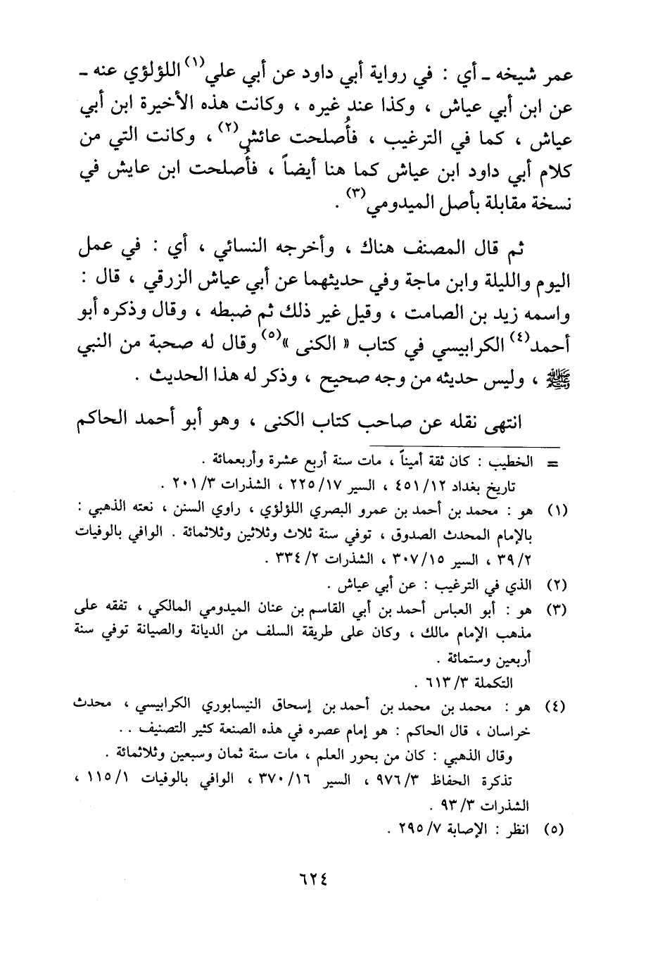 عمر شيخه- أي: في رواية أبي داود عن أبي علي اللؤلؤي عنه- عن ابن أبي عياش، وكذا عند غيره، وكانت هذه الأخيرة ابن أبي عياش، كما في الترغيب، فأُصلحت عائش، وكانت التي من كلام أبي داود ابن عياش كما هنا أيضاً، فأصلحت ابن عايش في نسخة مقابلة بأصل الميدومي.