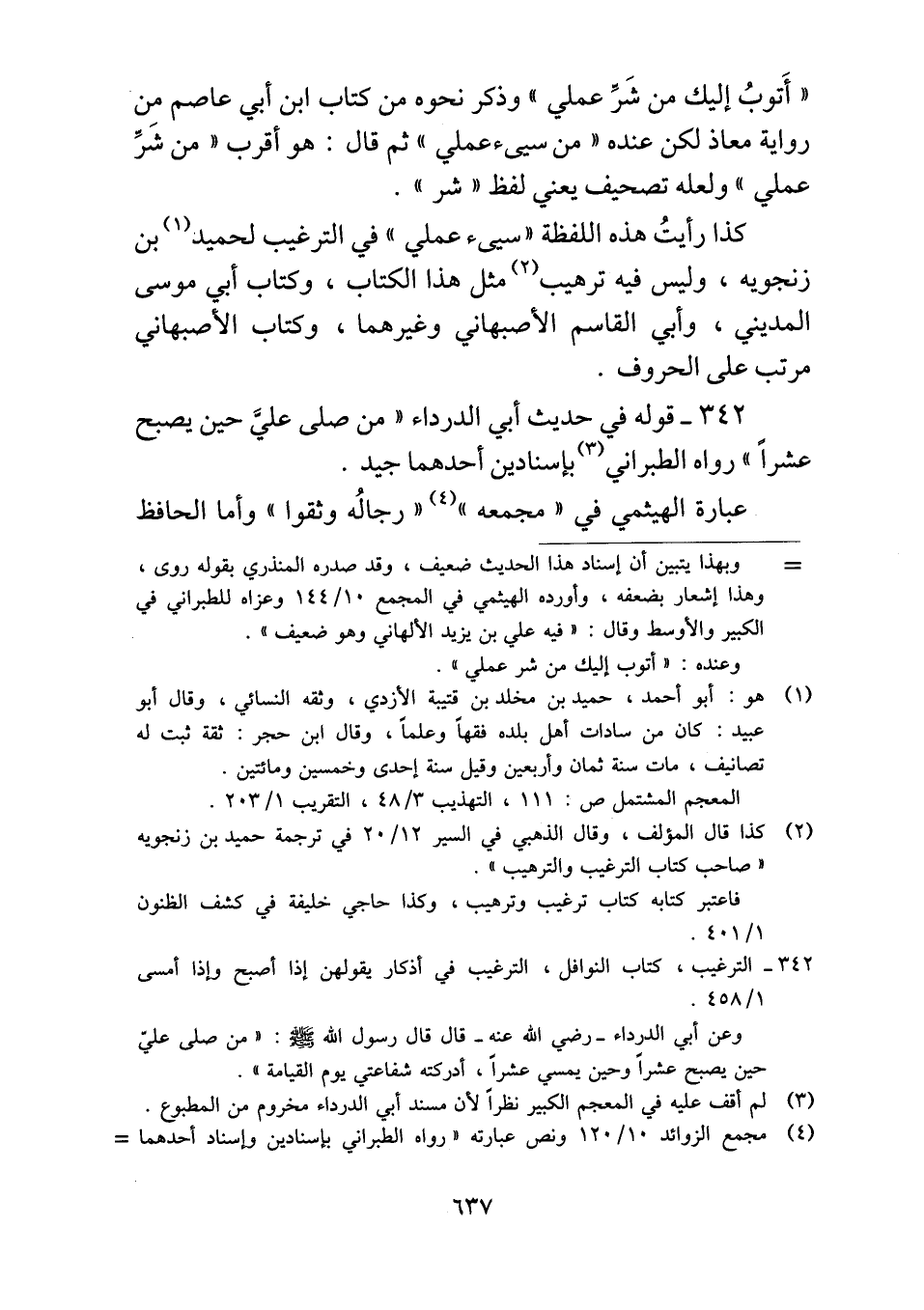 ٣٤٢ - قوله في حديث أبي الدرداء "من صلى عليَّ حين يصبح عشراً" رواه الطبراني بإسنادين أحدهما جيد.