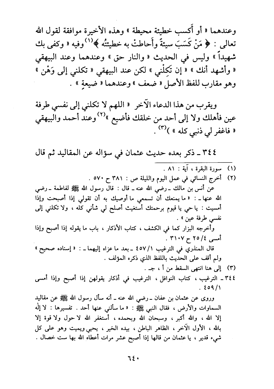 وعندهما "أو أَكسب خطيئة محيطة" وهذه الأخيرة موافقة لقول الله تعالى: {مَنْ كَسَبَ سَيِّئَةً وَأَحَاطَتْ بِهِ خَطِيئَتُهُ} وفيه "وكفى بك شهيداً" وليس في الحديث "والنار حق" وعندهما وعند البيهقي "وأشهد أنك" "إن تكِلْني" لكن عند البيهقي "تكلني إلى وَهْن" وهو مقارب للفظ الأصل "ضعف" وعندهما "ضيعةٍ".