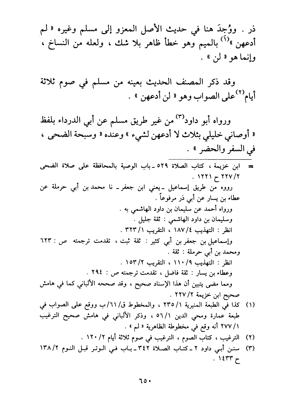 ذر. ووُجدَ هنا في حديث الأصل المعزو إلى مسلم وغيره "لم أدعهن" بالميم وهو خطأ ظاهر بلا شك، ولعله من النساخ، وإنما هو "لن".