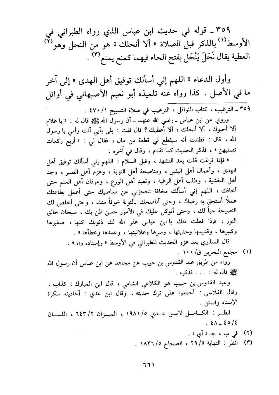 ٣٥٩ - قوله في حديث ابن عباس الذي رواه الطبراني في الأوسط بالذكر قبل الصلاة "ألا أنحلك" هو من النحل وهو العطية يقال نَحَلَ يَنْحَل بفتح الحاء فيهما كمنع يمنع.