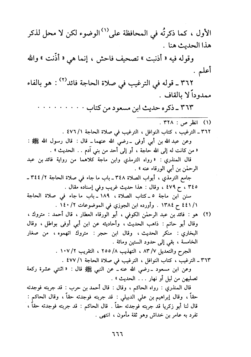 ٣٦٢ - قوله في الترغيب في صلاة الحاجة فائد: هو بالفاء ممدوداً لا بالقاف.