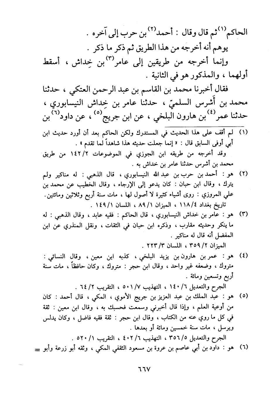 فقال أخبرنا محمد بن القاسم بن عبد الرحمن العتكي، حدثنا محمد بن أَشرس السلميّ، حدثنا عامر بن خِداش النيسابوري، حدثنا عمربن هارون البلخي، عن ابن جريج، عن داود بن
