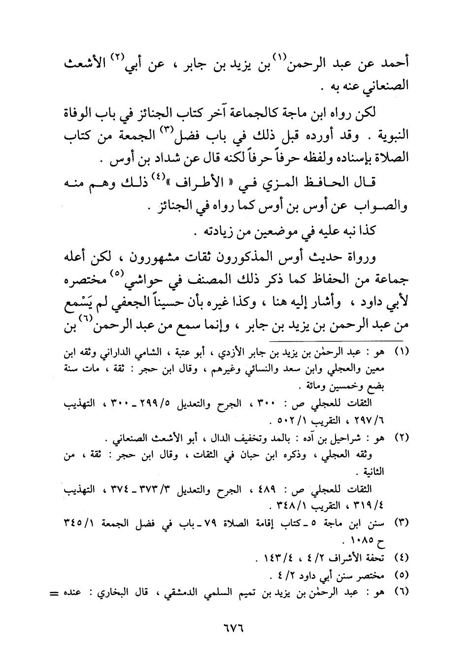 ورواة حديث أوس المذكورون ثقات مشهورون، لكن أعله جماعة من الحفاظ كما ذكر ذلك المصنف في حواشي مختصره لأبي داود، وأشار إليه هنا، وكذا غيره بأن حسيناً الجعفي لم يَسْمع من عبد الرحمن بن يزيد بن جابر، وإنما سمع من عبد الرحمن بن