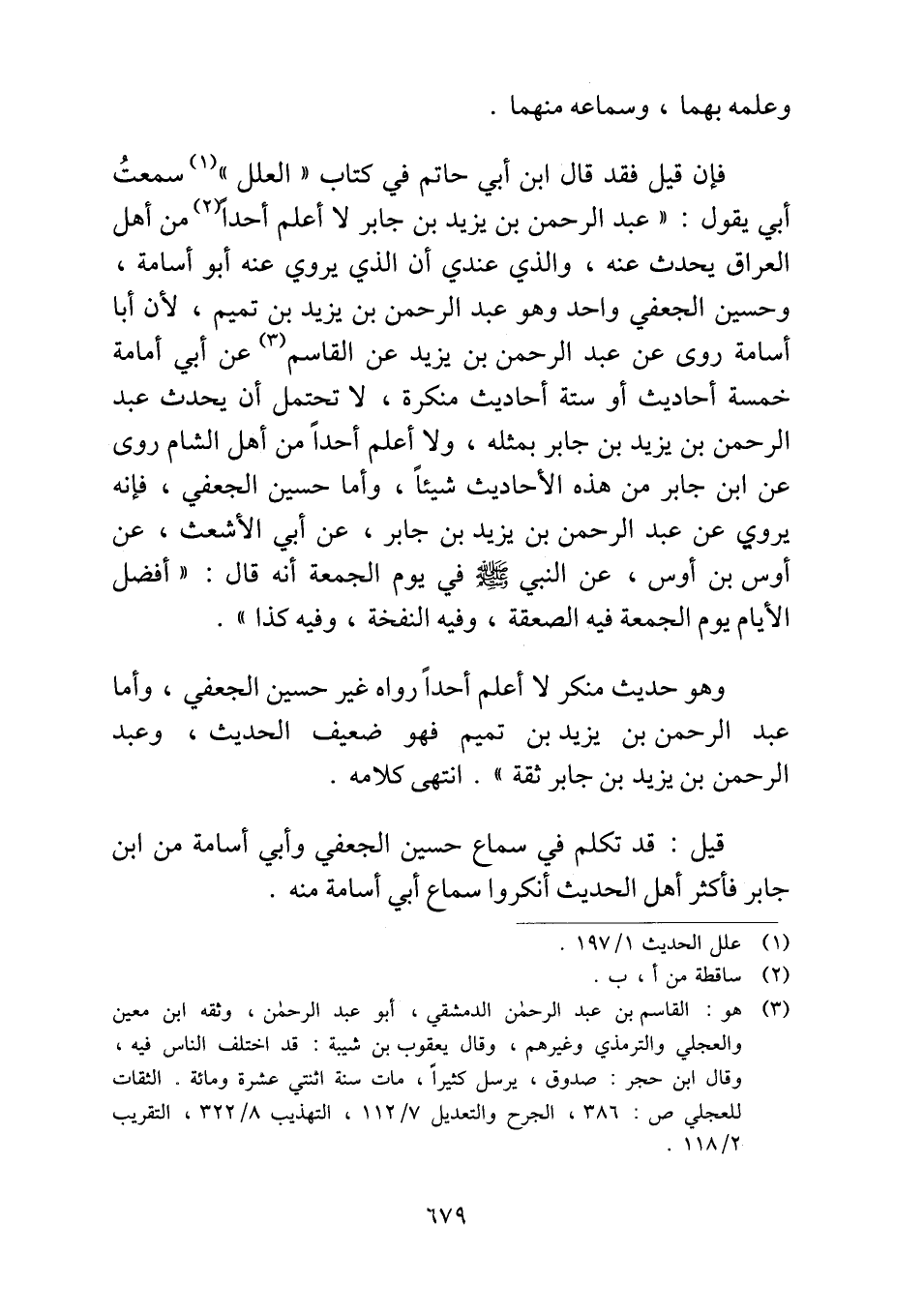 فإن قيل فقد قال ابن أبي حاتم في كتاب "العلل" سمعتُ أبي يقول: "عبد الرحمن بن يزيد بن جابر لا أعلم أحداً من أهل العراق يحدث عنه، والذي عندي أن الذي يروي عنه أبو أسامة، وحسين الجعفي واحد وهو عبد الرحمن بن يزيد بن تميم، لأن أبا أسامة روى عن عبد الرحمن بن يزيد عن القاسم عن أبي أمامة خمسة أحاديث أو ستة أحاديث منكرة، لا تحتمل أن يحدث عبد الرحمن بن يزيد بن جابر بمثله، ولا أعلم أحداً من أهل الشام روى عن ابن جابر من هذه الأحاديث شيئاً، وأما حسين الجعفي، فإنه يروي عن عبد الرحمن بن يزيد بن جابر، عن أبي الأشعث، عن أوس بن أوس، عن النبي - صلى الله عليه وسلم - في يوم الجمعة أنه قال: "أفضل الأيام يوم الجمعة فيه الصعقة، وفيه النفخة، وفيه كذا".