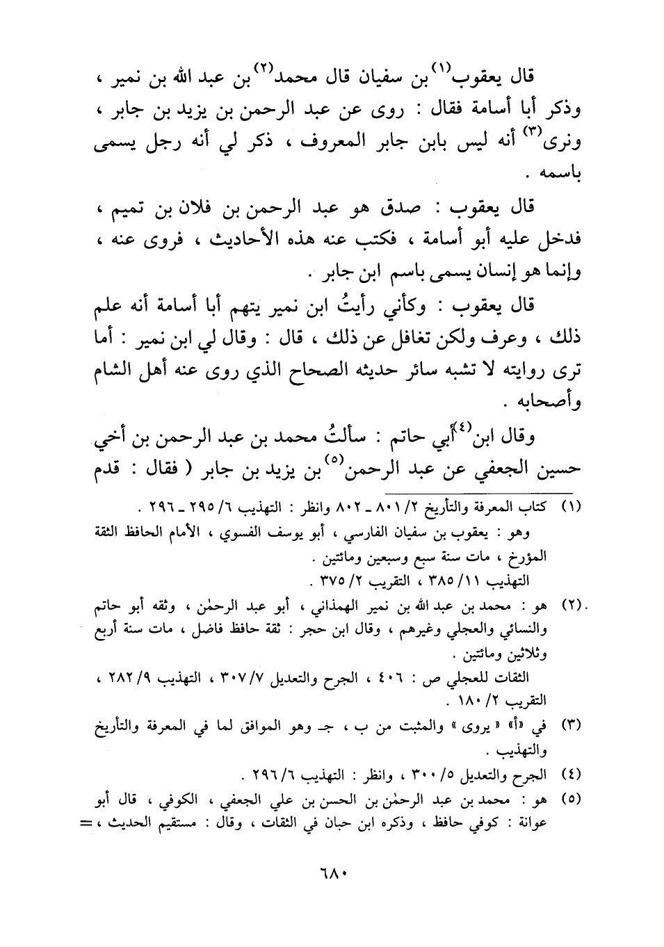 قال يعقوب بن سفيان قال محمد بن عبد الله بن نمير، وذكر أبا أسامة فقال: روى عن عبد الرحمن بن يزيد بن جابر، ونرى أنه ليس بابن جابر المعروف، ذكر لي أنه رجل يسمى باسمه.