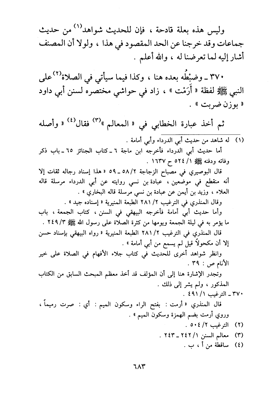 ٣٧٠ - وضبْطُه بعده هنا، وكذا فيما سيأتي في الصلاة على النبي - صلى الله عليه وسلم -لفظة "أَرَمْت"، زاد في حواشي مختصره لسنن أبي داود "بوزن ضربت".