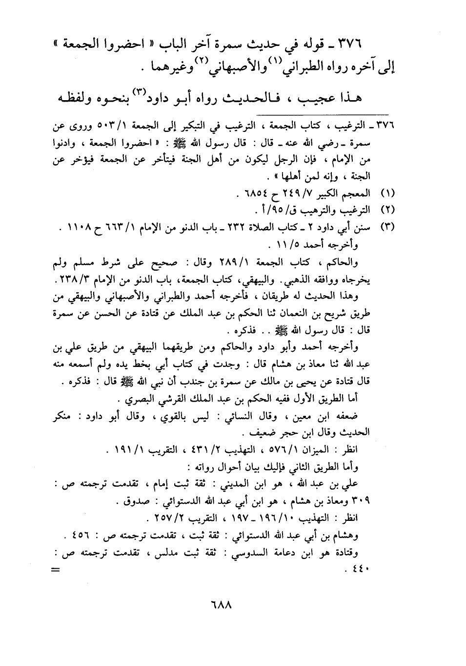 ٣٧٦ - قوله في حديث سمرة آخر الباب "احضروا الجمعة" إلى آخره رواه الطبراني والأصبهاني وغيرهما.