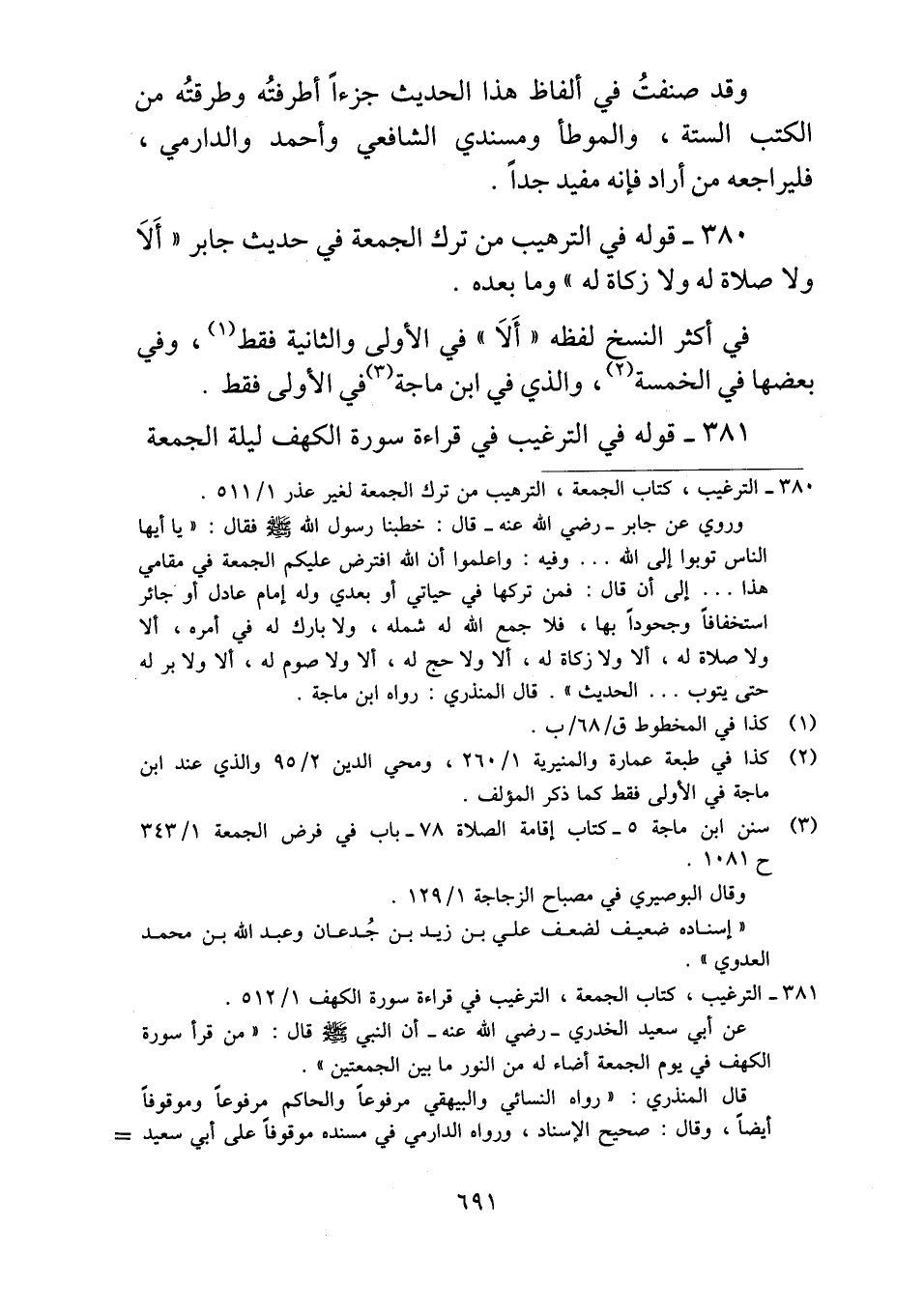 ٣٨٠ - قوله في الترهيب من ترك الجمعة في حديث جابر "أَلاَ ولا صلاة له ولا زكاة له" وما بعده.