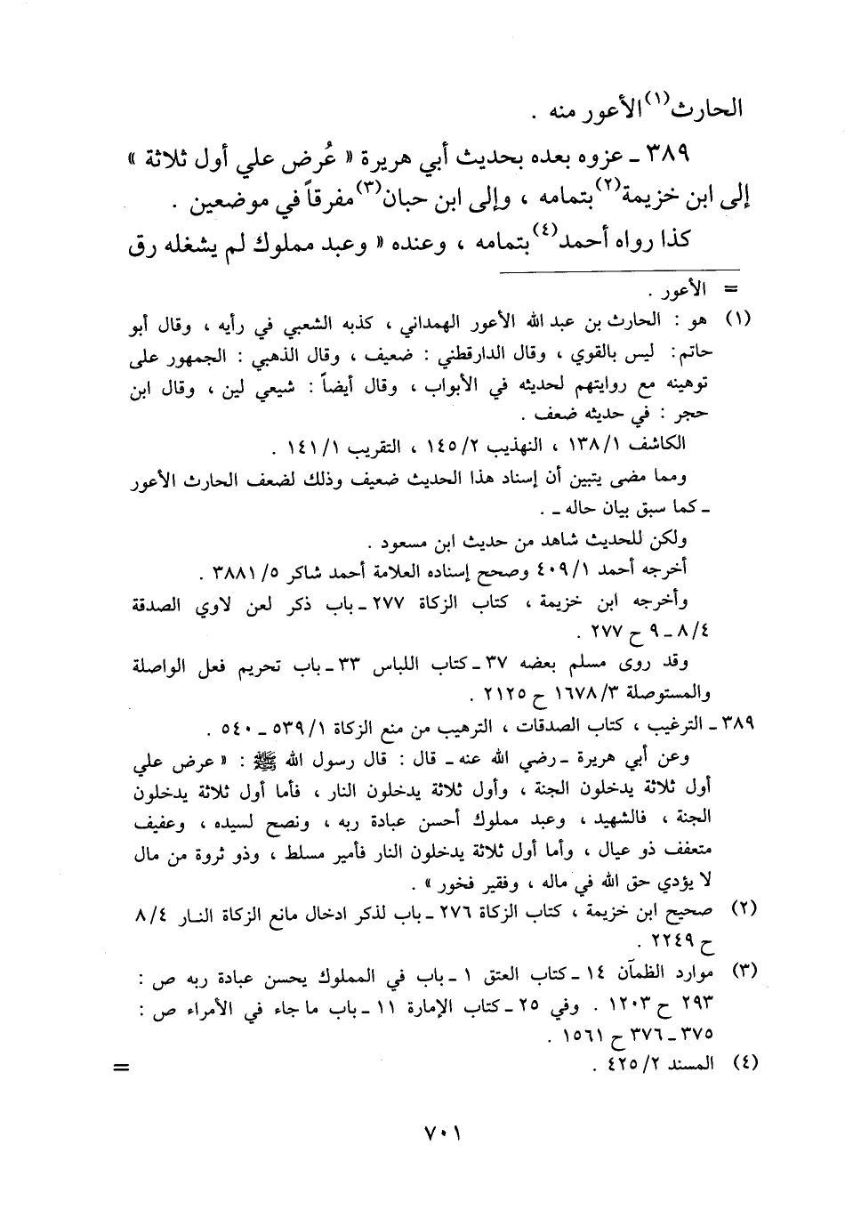 ٣٨٩ - عزوه بعده بحديث أبي هريرة "عُرض علي أول ثلاثة" إلى ابن خزيمة بتمامه، وإلى ابن حبان مفرقاً في موضعين.