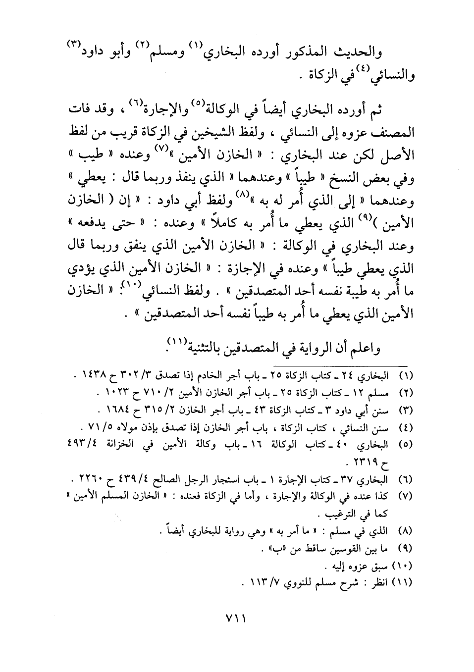ثم أورده البخاري أيضاً في الوكالة والإجارة، وقد فات المصنف عزوه إلى النسائي، ولفظ الشيخين في الزكاة قريب من لفظ الأصل لكن عند البخاري: "الخازن الأمين" وعنده "طيب" وفي بعض النسخ "طيباً" وعندهما "الذي ينفذ وربما قال: يعطي" وعندهما "إلى الذي أُمر له به" ولفظ أبي داود: "إن (الخازن الأمين) الذي يعطي ما أُمر به كاملاً" وعنده: "حتى يدفعه" وعند البخاري في الوكالة: "الخازن الأمين الذي ينفق وربما قال الذي يعطي طيباً" وعنده في الإجازة: "الخازن الأمين الذي يؤدي ما أُمر به طيبة نفسه أحد المتصدقين". ولفظ النسائي "الخازن الأمين الذي يعطي ما أُمر به طيباً نفسه أحد المتصدقين".