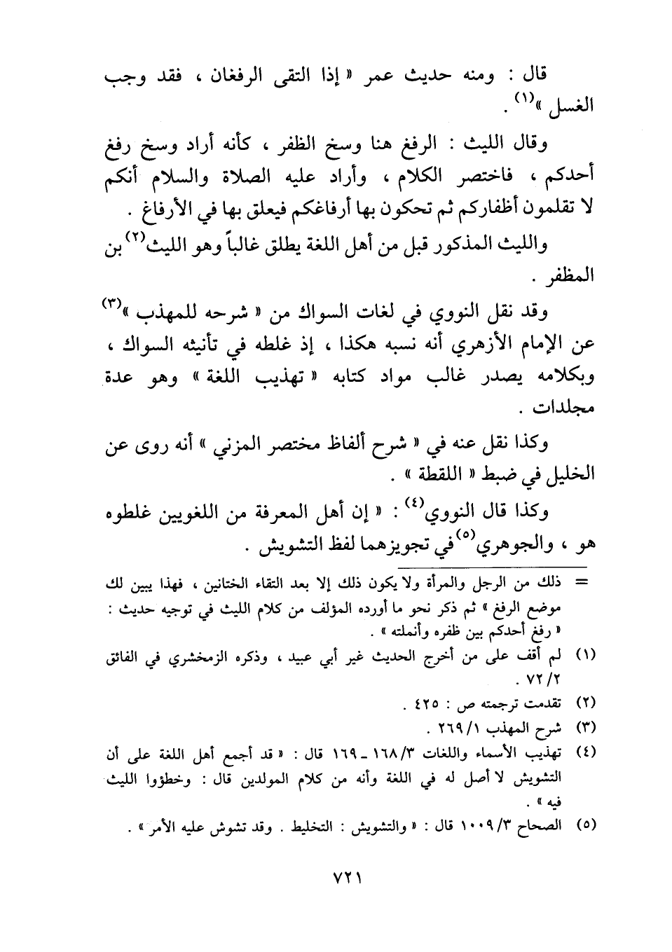 وقد نقل النووي في لغات السواك من "شرحه للمهذب" عن الإمام الأزهري أنه نسبه هكذا، إذ غلطه في تأنيثه السواك، وبكلامه يصدر غالب مواد كتابه "تهذيب اللغة" وهو عدة مجلدات.