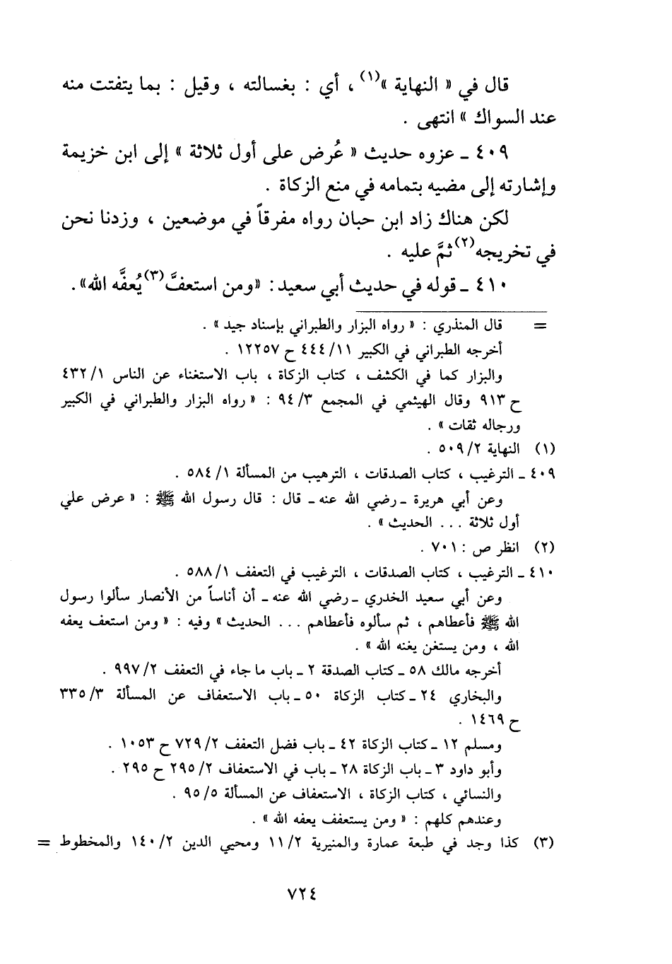 ٤٠٩ - عزوه حديث "عُرض على أول ثلاثة" إلى ابن خزيمة وإشارته إلى مضيه بتمامه في منع الزكاة.