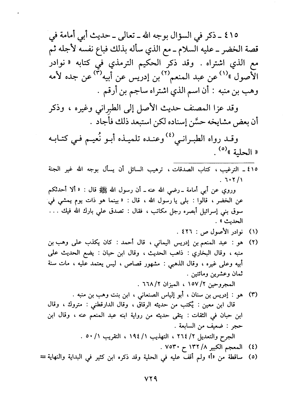 ٤١٥ - ذكر في السؤال بوجه الله -تعالى- حديث أبي أمامة في قصة الخضر -عليه السلام- مع الذي سأله بذلك فباع نفسه لأجله ثم مع الذي اشتراه. وقد ذكر الحكيم الترمذي في كتابه "نوادر الأصول" عن عبد المنعم بن إدريس عن أبيه عن جده لأمه وهب بن منبه: أن اسم الذي اشتراه ساجم بن أرقم.