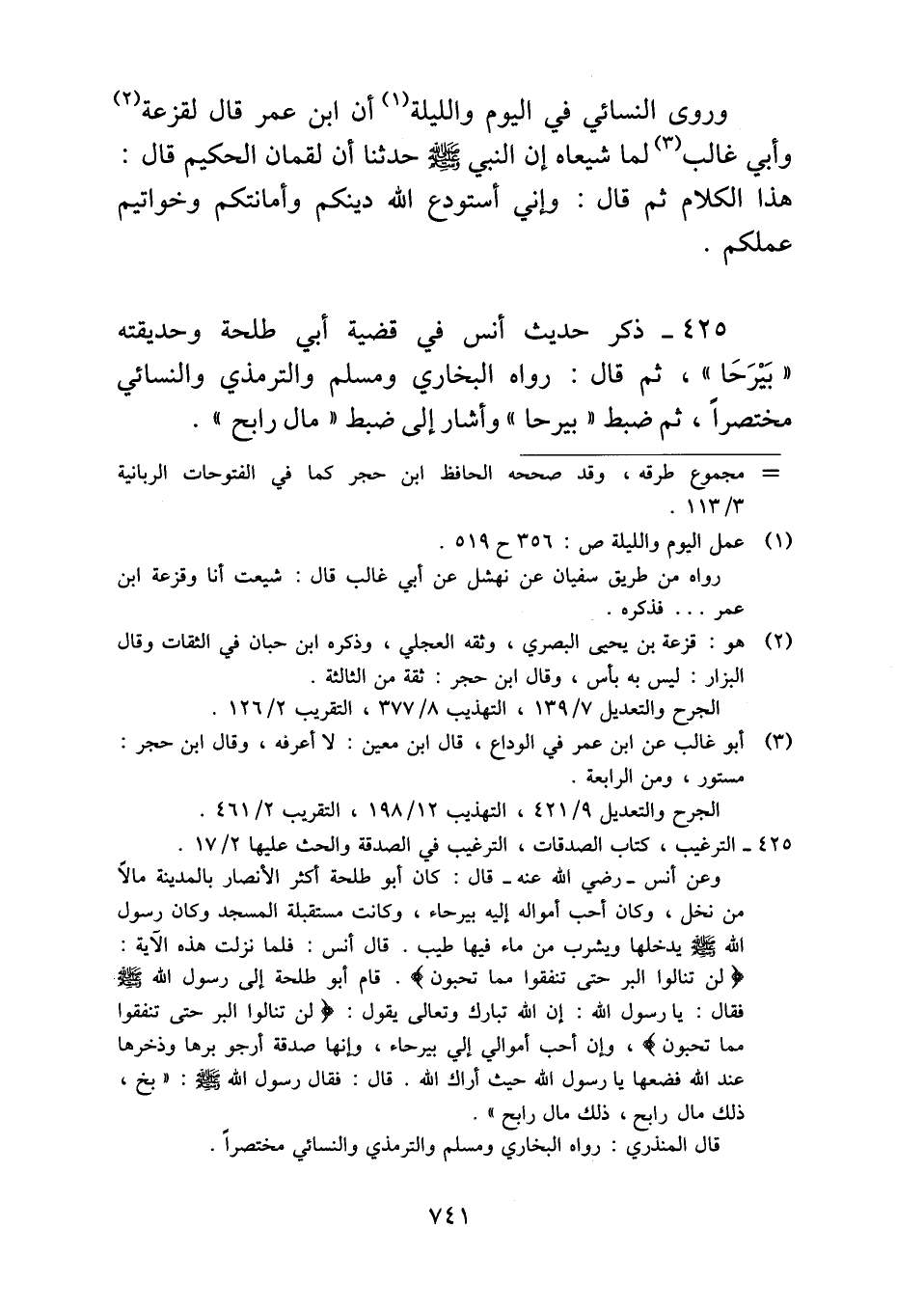 ٤٢٥ - ذكر حديث أنس في قضية أبي طلحة وحديقته "بَيْرَحَا"، ثم قال: رواه البخاري ومسلم والترمذي والنسائي مختصراً، ثم ضبط "بيرحا" وأشار إلى ضبط "مال رابح".