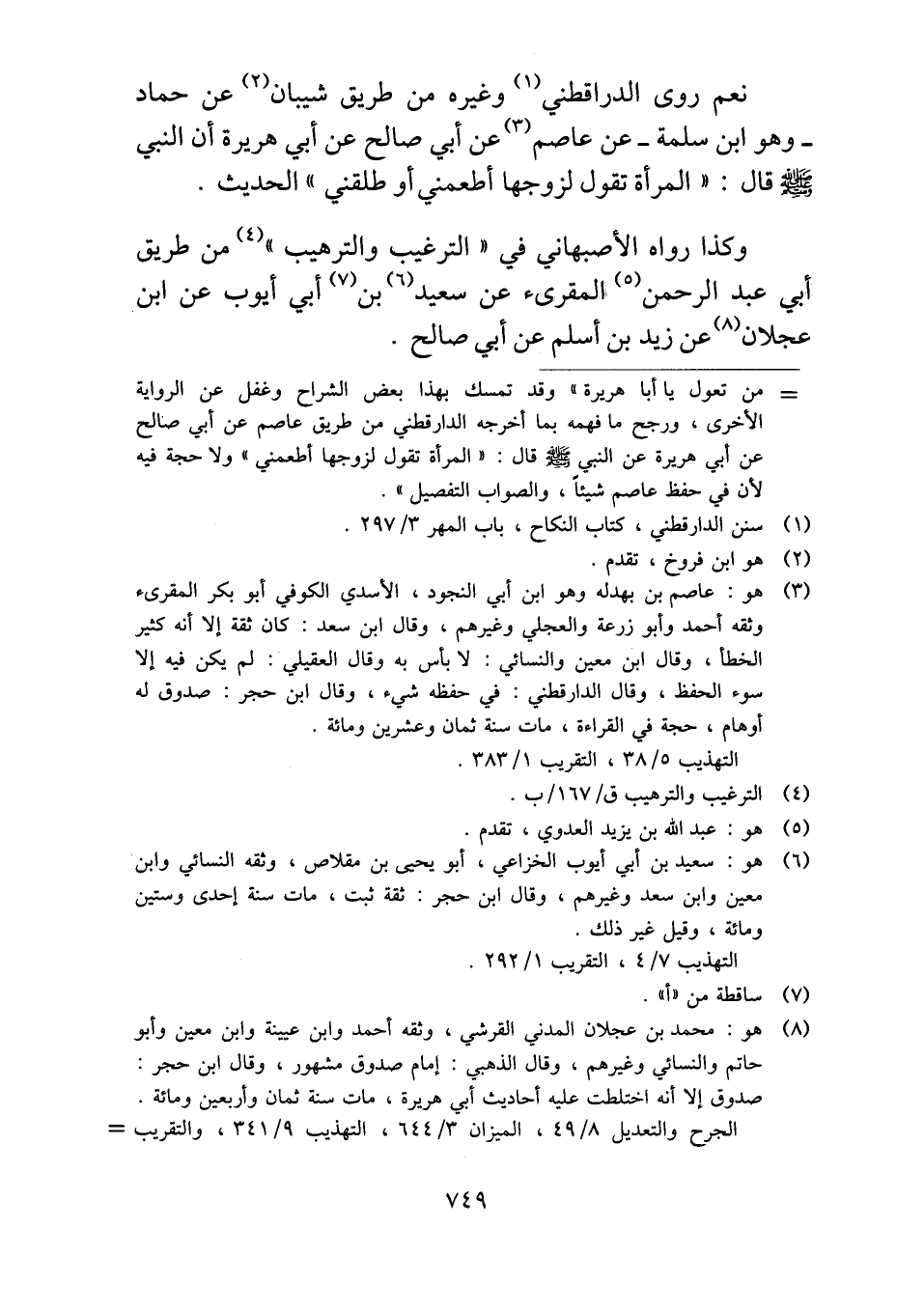 -وهو ابن سلمة- عن عاصم عن أبي صالح عن أبي هريرة أن النبي - صلى الله عليه وسلم - قال: "المرأة تقول لزوجها أطعمني أو طلقني" الحديث.