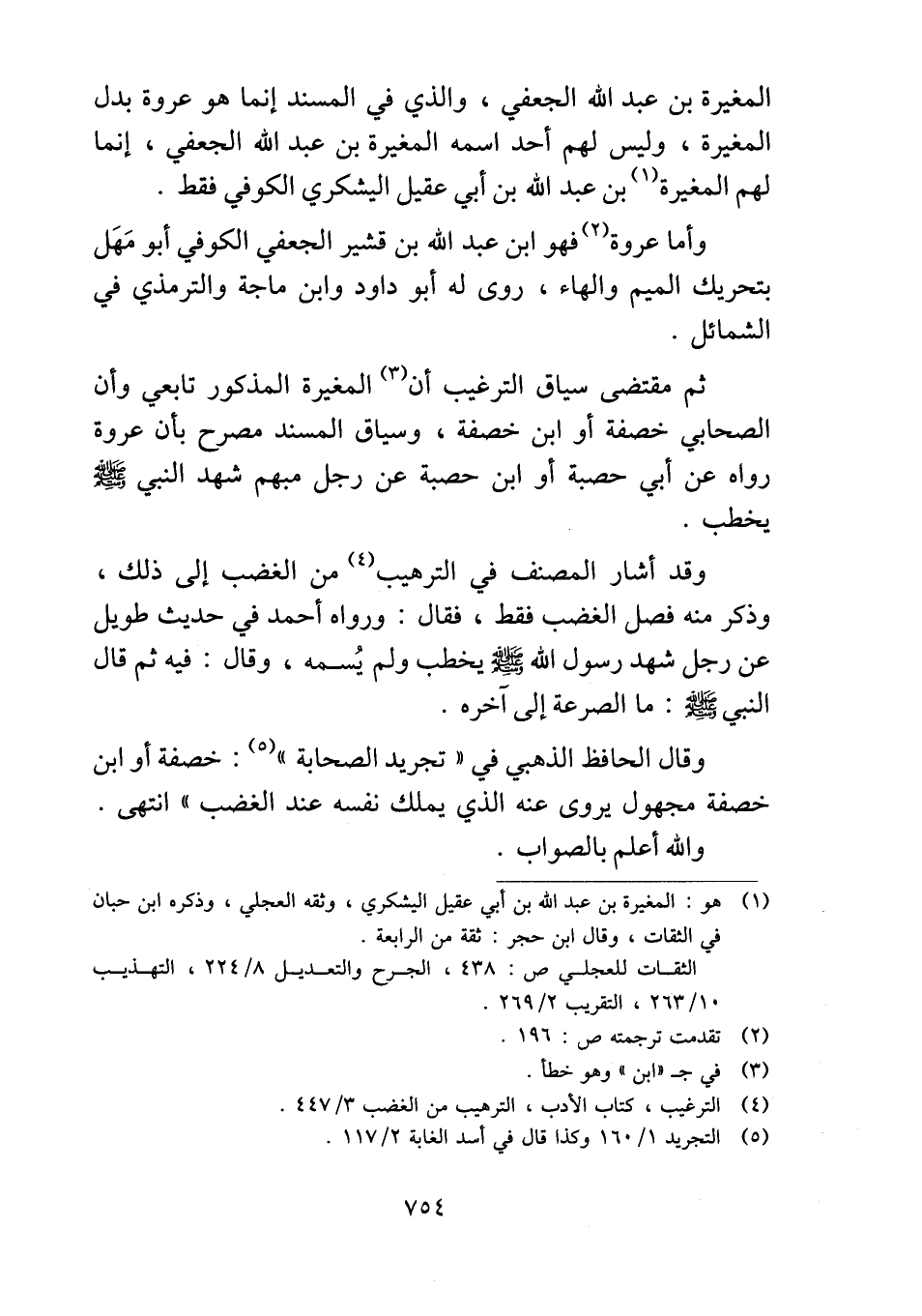 ثم مقتضى سياق الترغيب أن المغيرة المذكور تابعي وأن الصحابي خصفة أو ابن خصفة، وسياق المسند مصرح بأن عروة رواه عن أبي حصبة أو ابن حصبة عن رجل مبهم شهد النبي - صلى الله عليه وسلم - يخطب.