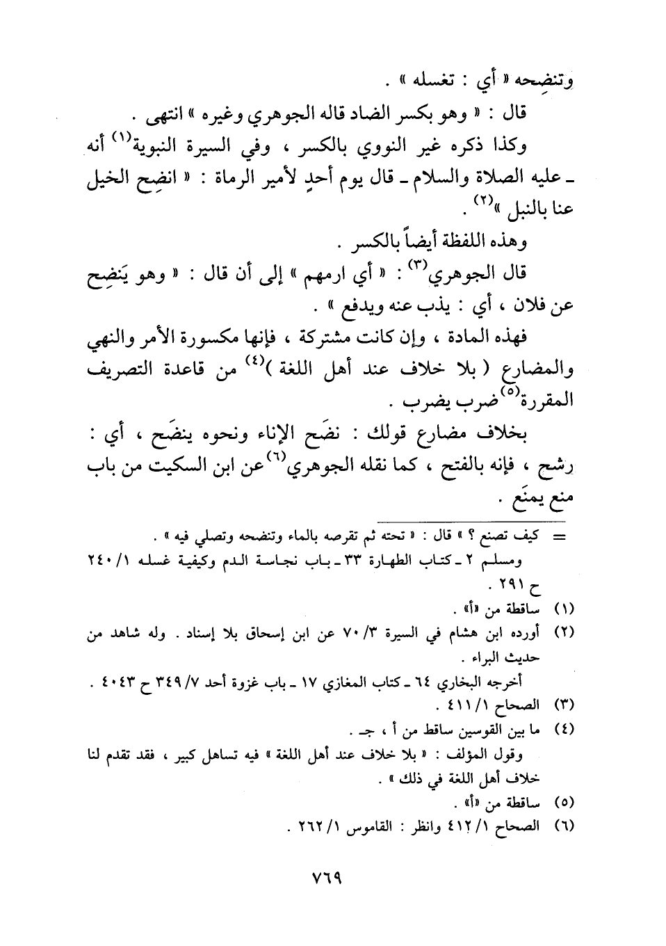 وكذا ذكره غير النووي بالكسر، وفي السيرة النبوية أنه -عليه الصلاة والسلام- قال يوم أحدٍ لأمير الرماة: "انضِح الخيل عنا بالنبل".