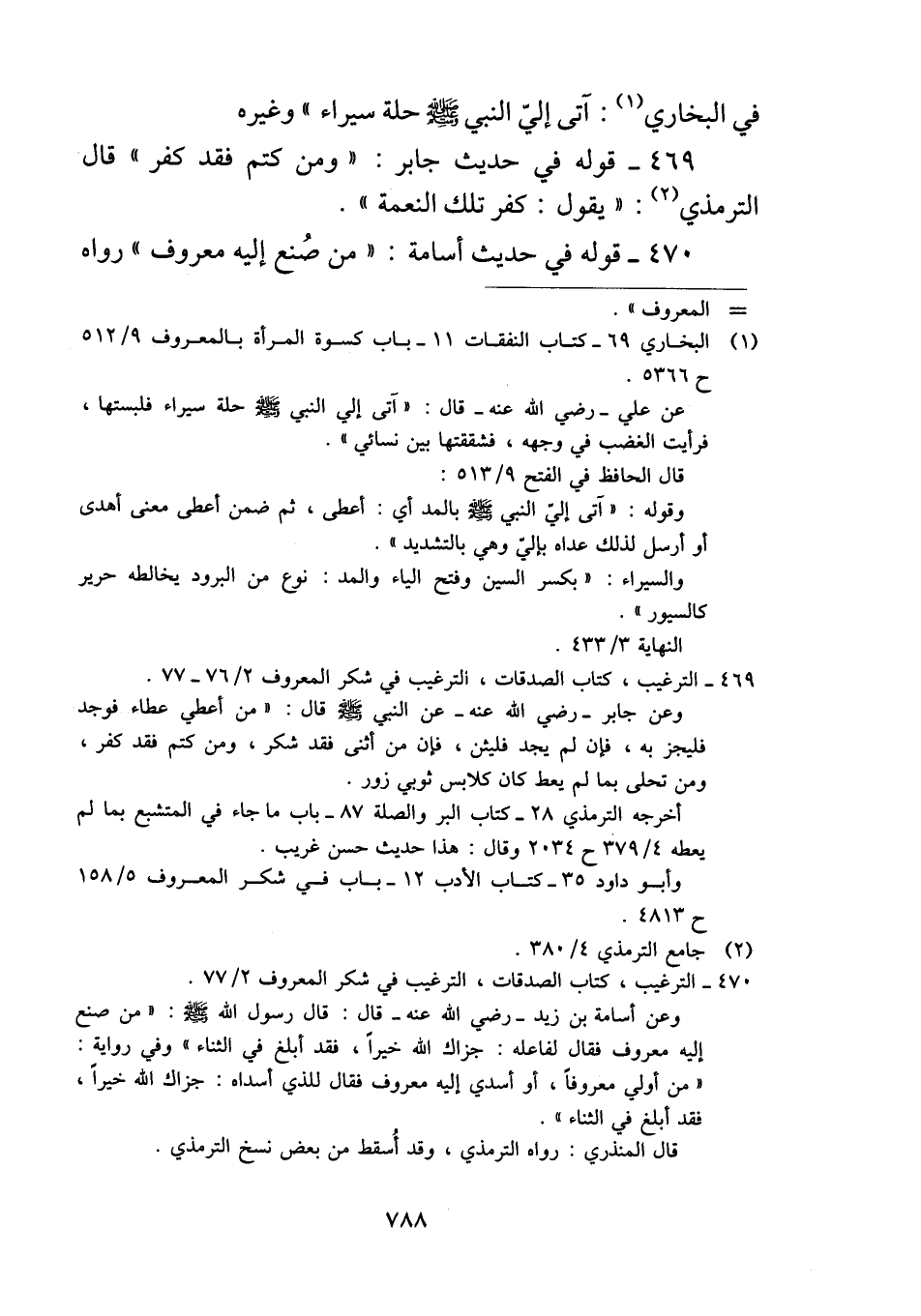 ٤٦٩ - قوله في حديث جابر: "ومن كتم فقد كفر" قال الترمذي: "يقول: كفر تلك النعمة".