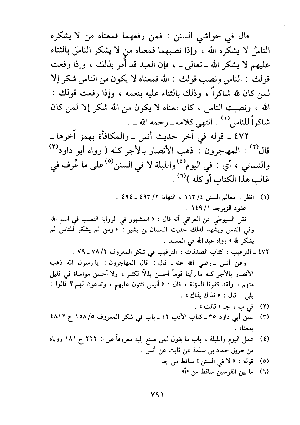 ٤٧٢ - قوله في آخر حديث أنس -والمكافأة بهمز آخرها- قال: المهاجرون: ذهب الأنصار بالأجر كله (رواه أبو داود والنسائي، أي: في اليوم والليلة لا في السنن على ما عُرف في غالب هذا الكتاب أو كله).