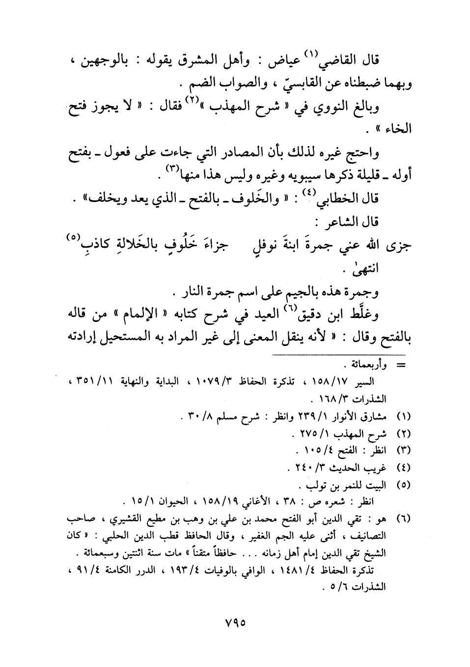 وغلَّط ابن دقيق العيد في شرح كتابه "الإلمام" من قاله بالفتح وقال: "لأنه ينقل المعنى إلى غير المراد به المستحيل إرادته
