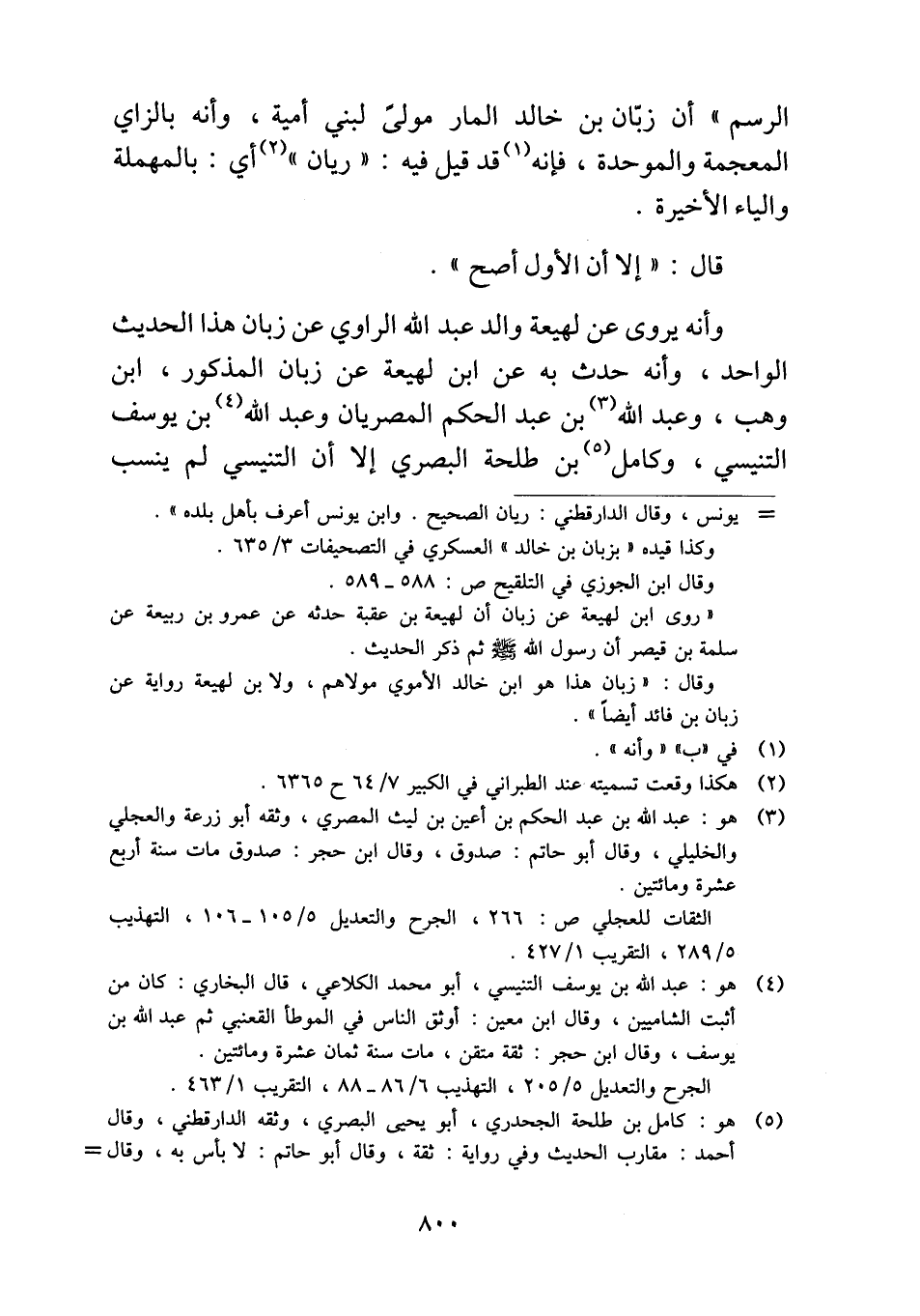 الرسم" أن زبّان بن خالد المار مولىً لبني أمية، وأنه بالزاي المعجمة والموحدة، فإنه قد قيل فيه: "ريان" أي: بالمهملة والياء الأخيرة.