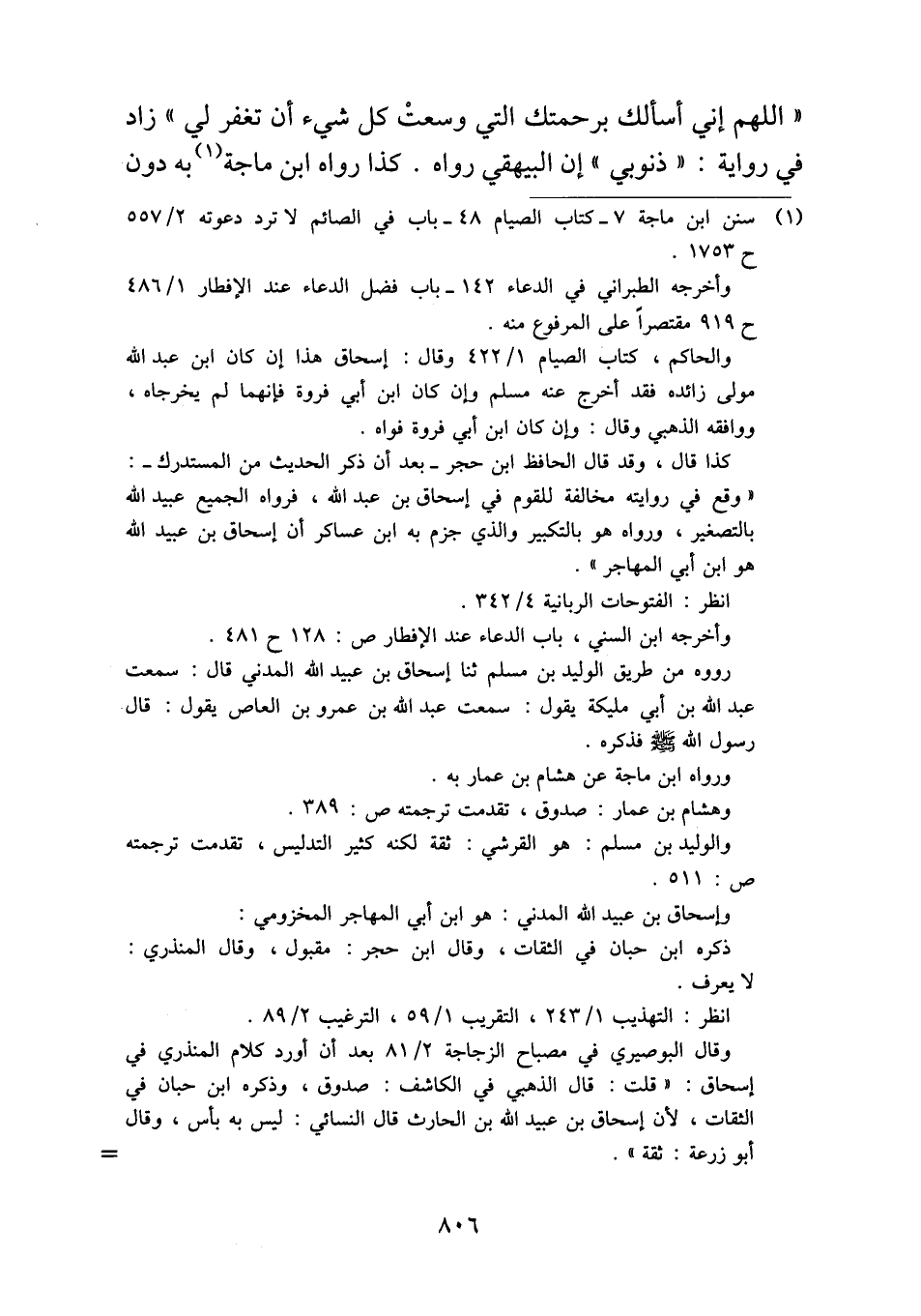 "اللهم إني أسألك برحمتك التي وسعتْ كل شيء أن تغفر لي" زاد في رواية: "ذنوبي" إن البيهقي رواه. كذا رواه ابن ماجة به دون