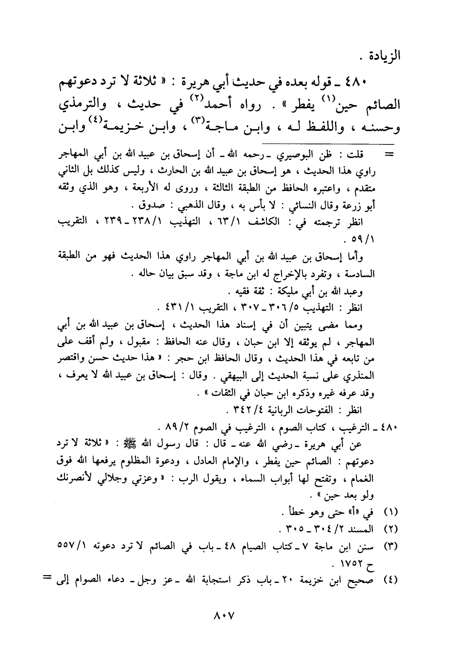 ٤٨٠ - قوله بعده في حديث أبي هريرة: "ثلاثة لا ترد دعوتهم الصائم حين يفطر". رواه أحمد في حديث، والترمذي وحسنه، واللفظ له، وابن ماجة، وابن خزيمة وابن