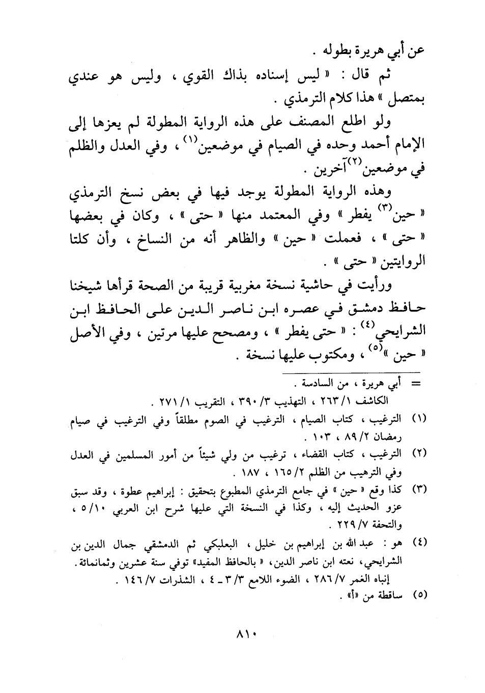 وهذه الرواية المطولة يوجد فيها في بعض نسخ الترمذي "حين يفطر" وفي المعتمد منها "حتى"، وكان في بعضها "حتى"، فعملت "حين" والظاهر أنه من النساخ، وأن كلتا الروايتين "حتى".