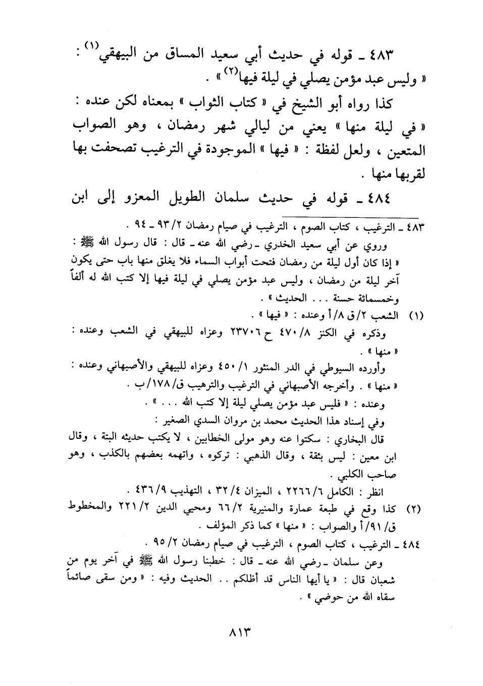 ٤٨٣ - قوله في حديث أبي سعيد المساق من البيهقي: "وليس عبد مؤمن يصلي في ليلة فيها".