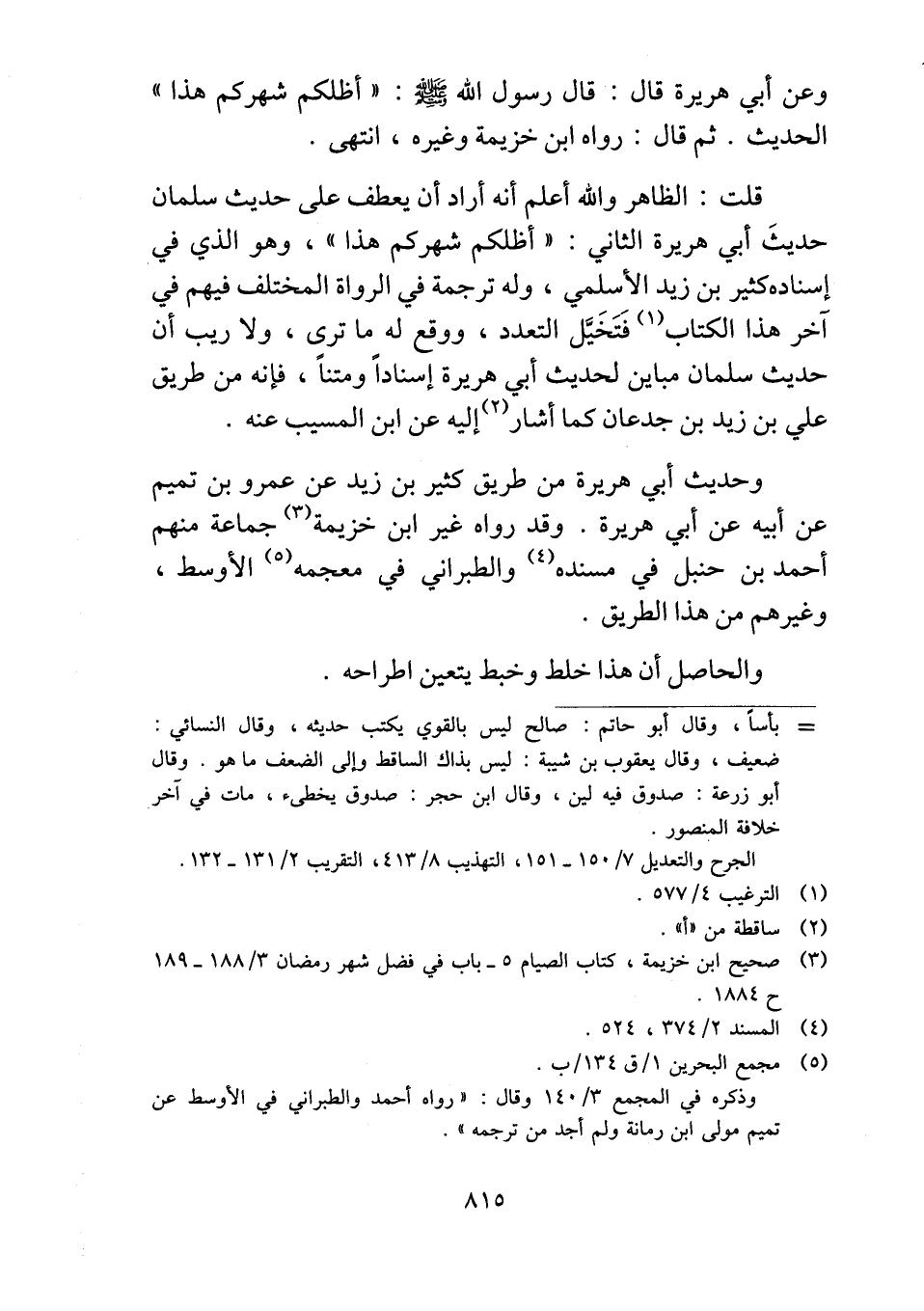 قلت: الظاهر والله أعلم أنه أراد أن يعطف على حديث سلمان حديثَ أبي هريرة الثاني: "أظلكم شهركم هذا"، وهو الذي في إسناده كثير بن زيد الأسلمي، وله ترجمة في الرواة المختلف فيهم في آخر هذا الكتاب فَتَخَيَّل التعدد، ووقع له ما ترى، ولا ريب أن حديث سلمان مباين لحديث أبي هريرة إسناداً ومتناً، فإنه من طريق علي بن زيد بن جدعان كما أشار إليه عن ابن المسيب عنه.