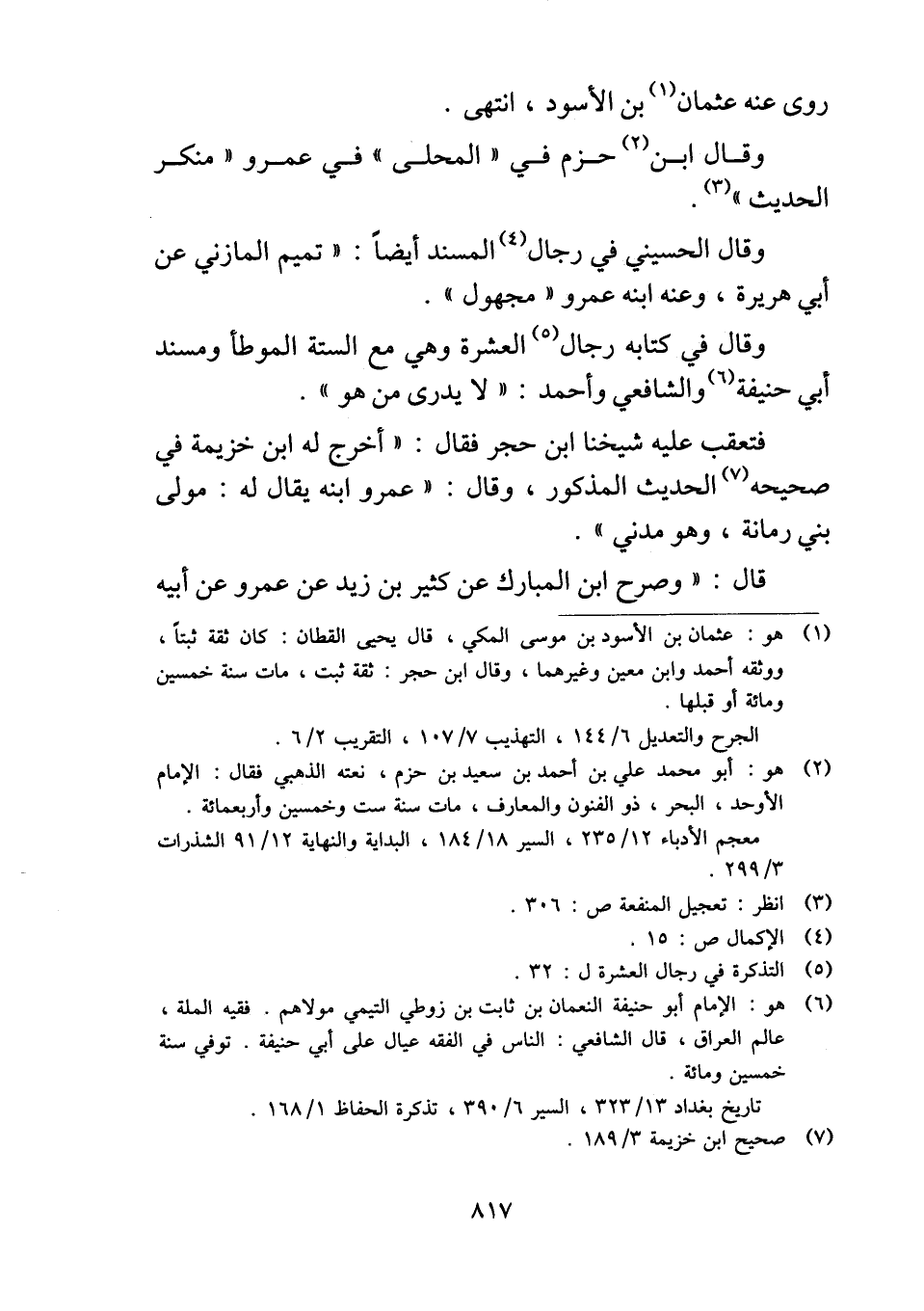 فتعقب عليه شيخنا ابن حجر فقال: "أخرج له ابن خزيمة في صحيحه الحديث المذكور، وقال: "عمرو ابنه يقال له: مولى بني رمانة، وهو مدني".