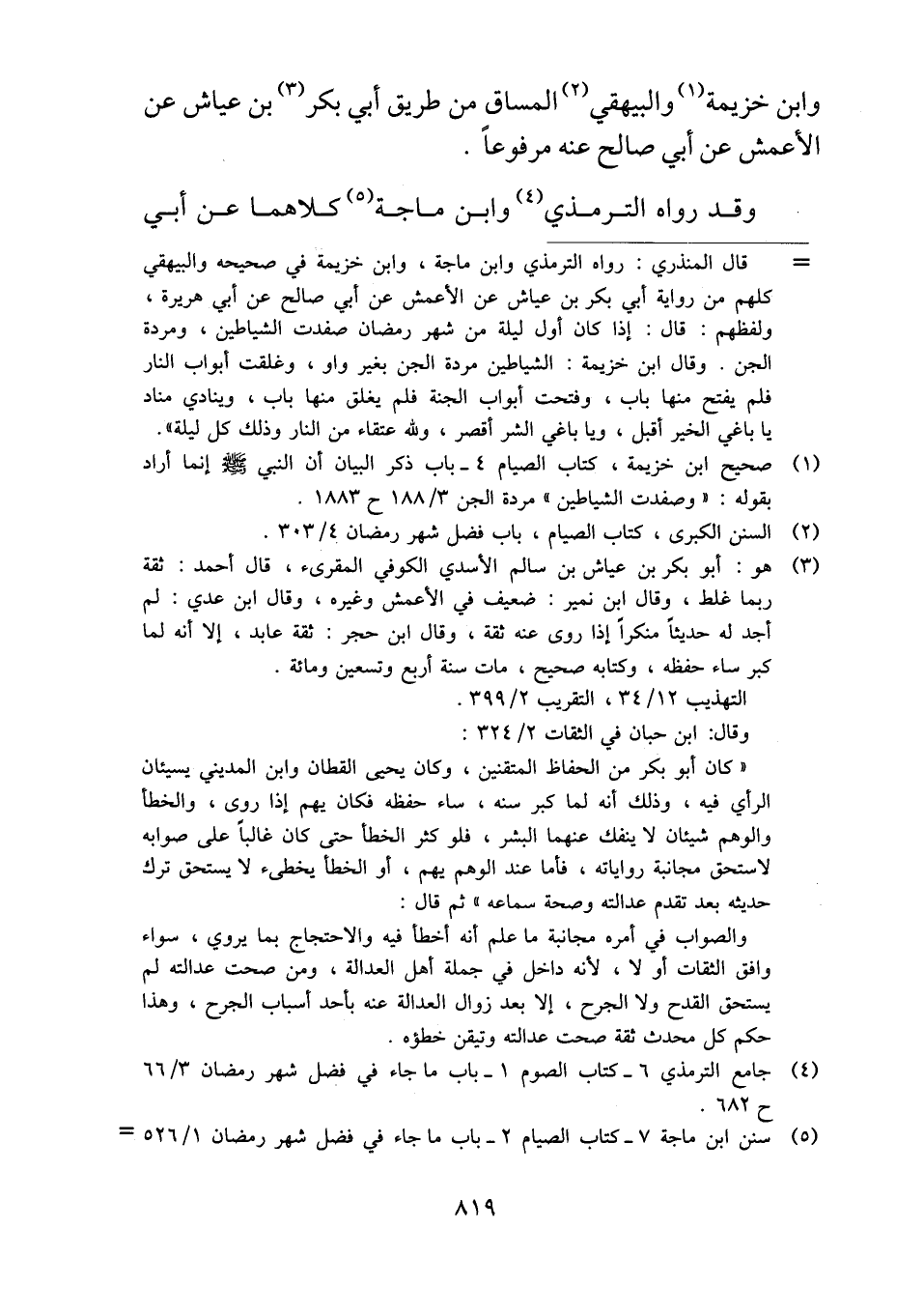وابن خزيمة والبيهقي المساق من طريق أبي بكر بن عياش عن الأعمش عن أبي صالح عنه مرفوعاً.
