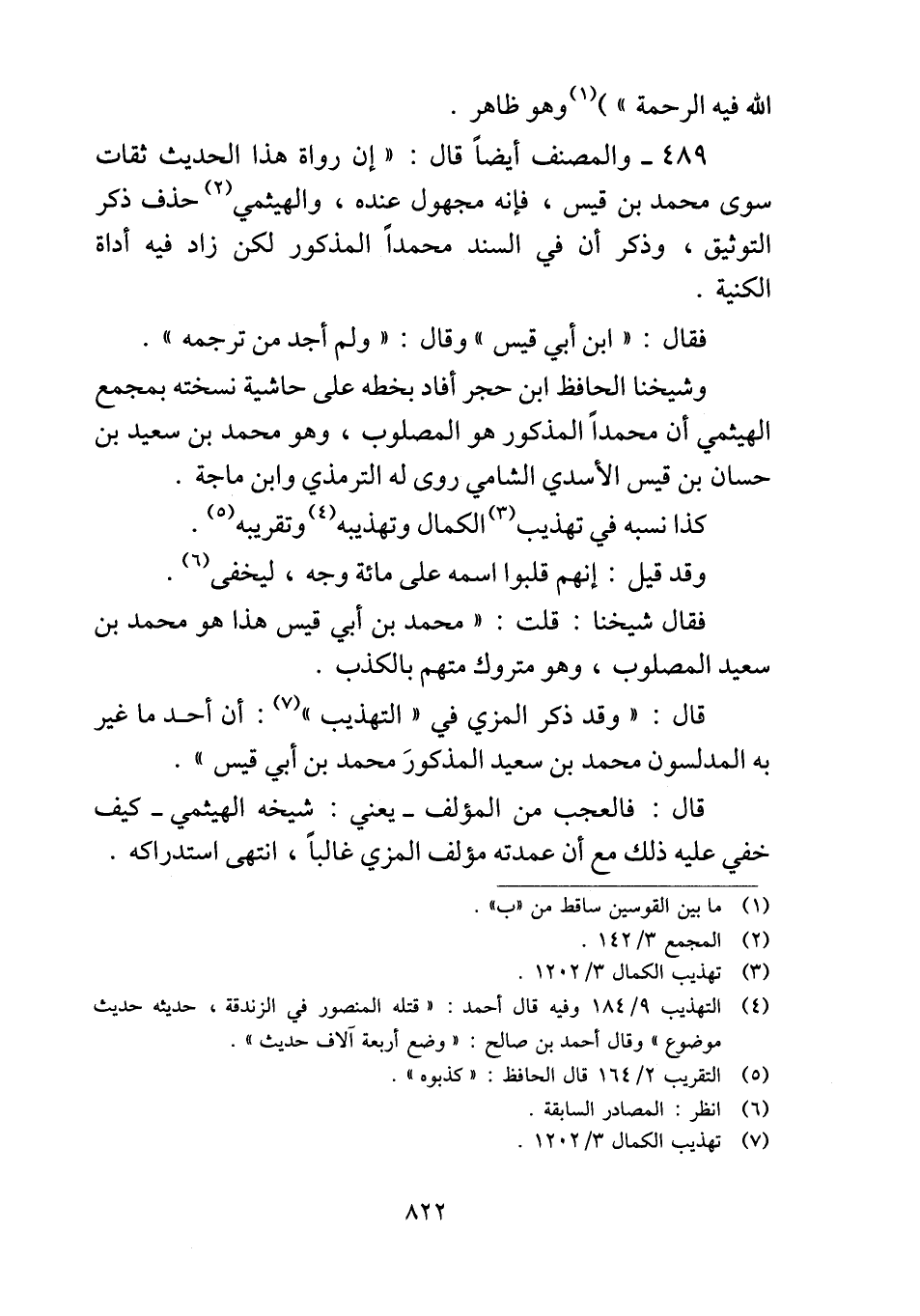 ٤٨٩ - والمصنف أيضاً قال: "إن رواة هذا الحديث ثقات سوى محمد بن قيس، فإنه مجهول عنده، والهيثمي حذف ذكر التوثيق، وذكر أن في السند محمداً المذكور لكن زاد فيه أداة الكنية.