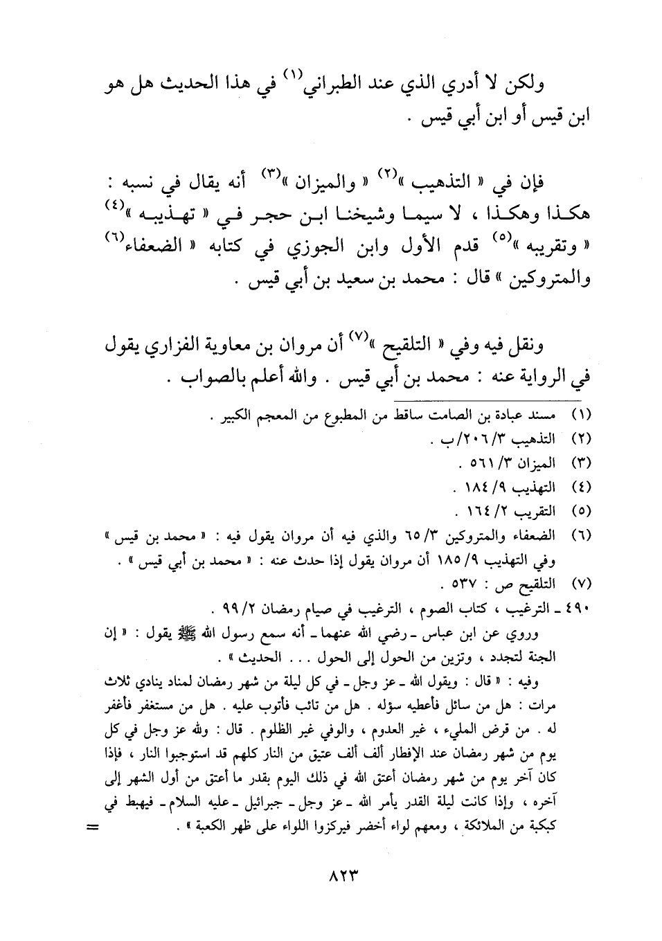 فإن في "التذهيب" "والميزان" أنه يقال في نسبه: هكذا وهكذا، لا سيما وشيخنا ابن حجر في "تهذيبه" "وتقريبه" قدم الأول وابن الجوزي في كتابه "الضعفاء والمتروكين" قال: محمد بن سعيد بن أبي قيس.