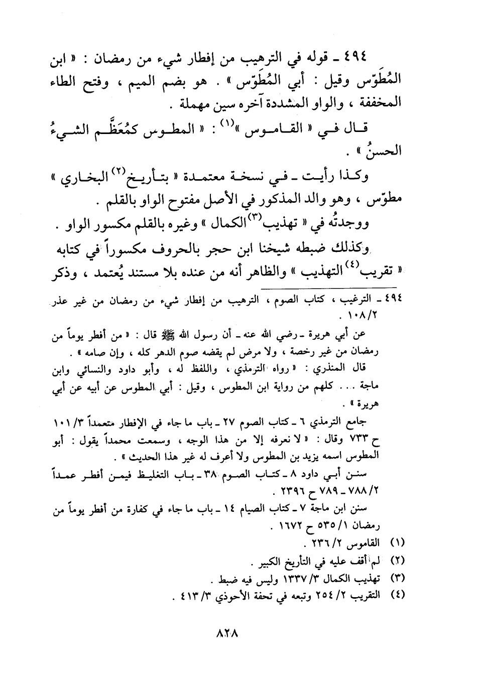 ٤٩٤ - قوله في الترهيب من إفطار شيء من رمضان: "ابن المُطَوّس وقيل: أبي المُطَوّس". هو بضم الميم، وفتح الطاء المخففة، والواو المشددة آخره سين مهملة.