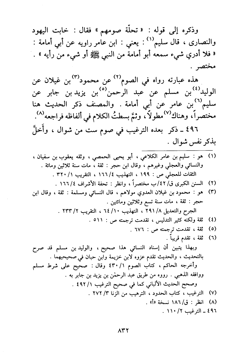 وذكره إلى قوله: "تحلّة صومهم" فقال: خابت اليهود والنصارى، قال سليم: يعني: ابن عامر راويه عن أبي أمامة: "فلا أدري شيء سمعه أبو أمامة من النبي - صلى الله عليه وسلم - أو شيء من رأيه". مختصر.