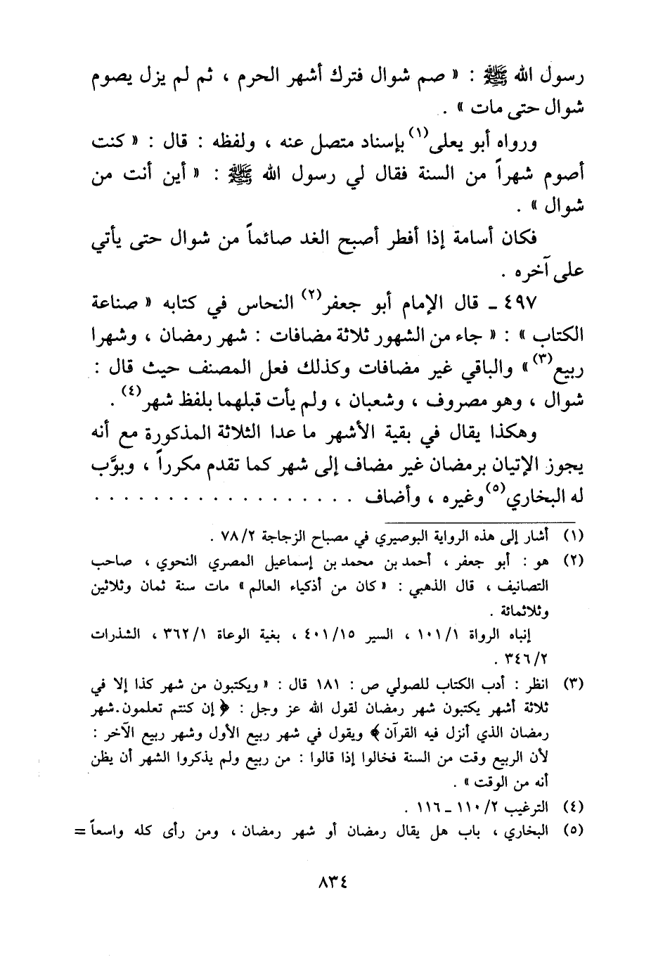 ٤٩٧ - قال الإمام أبو جعفر النحاس في كتابه "صناعة الكتاب": "جاء من المشهور ثلاثة مضافات: شهر رمضان، وشهرا ربيع" والباقي غير مضافات وكذلك فعل المصنف حيث قال: شوال، وهو مصروف، وشعبان، ولم يأت قبلهما بلفظ شهر.