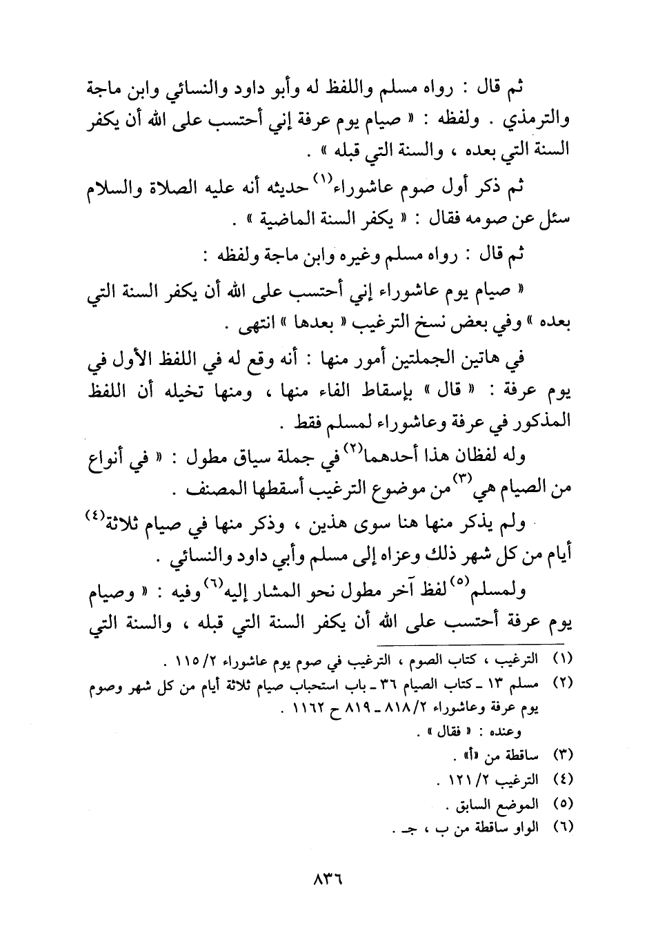 ثم قال: رواه مسلم واللفظ له وأبو داود والنسائي وابن ماجة والترمذي. ولفظه: "صيام يوم عرفة إني أحتسب على الله أن يكفر السنة التي بعده، والسنة التي قبله".